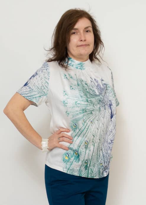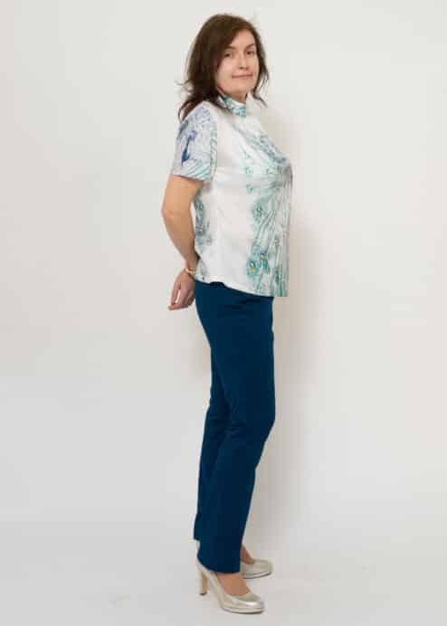 Diese Bluse ist aus einem besonders feinem glänzenden Stoff mit Freude in der Steiermark gefertigt. Dieser „Seidenersatz“ ist aus feinem Ecovero Rayon Satin von C.Pauli gerfertigt. Vorher wird der Stoff per Hand von Susanne Huber mit dem neuen Pfauenzauber-Motiv von Hand bedruckt. Jedes Stück ist somit ein Unikat. Der Stehkragen wird am Rücken gebunden – der Schnitt ist locker leger mit kurzen Ärmeln.