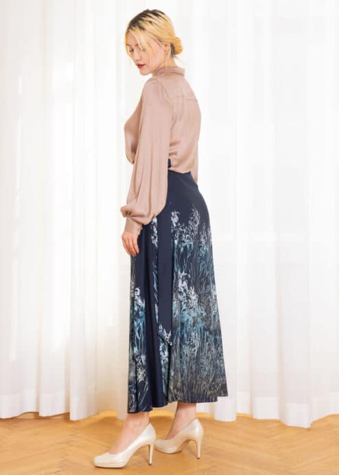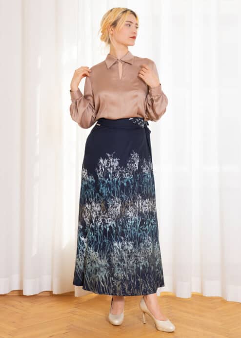 Ein langer Wickelrock in elegantem Navy, doppelt bedruckt mit dem Motiv “Mystic Iris”. Der leichte Lenzing® Ecovero® Holzstoff fällt wunderschön und vermittelt ein ausgesprochen angenehmes Gefühl beim Tragen. Das Druckmotiv in Weiß, Blau und beige kommt sehr edel zur Geltung.