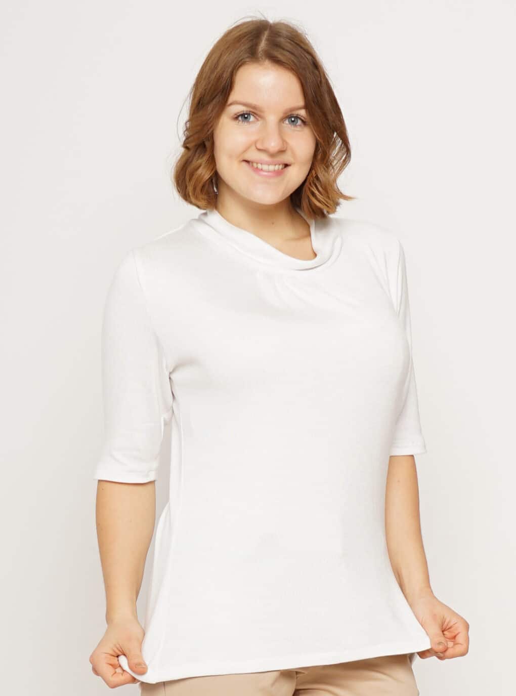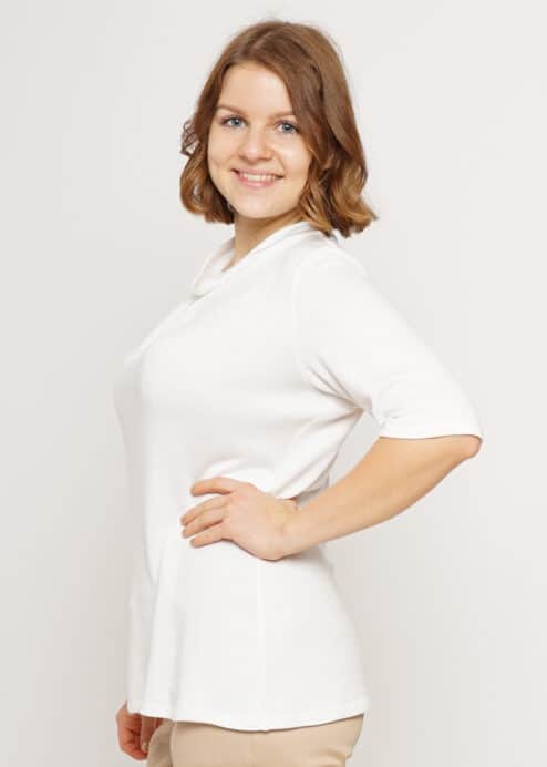 Der hübsche Pullover mit eingezogenem Kragen und Dreiviertelärmel fühlt sich durch den schön glänzendem Strickstoff wunderbar weich auf der Haut an.