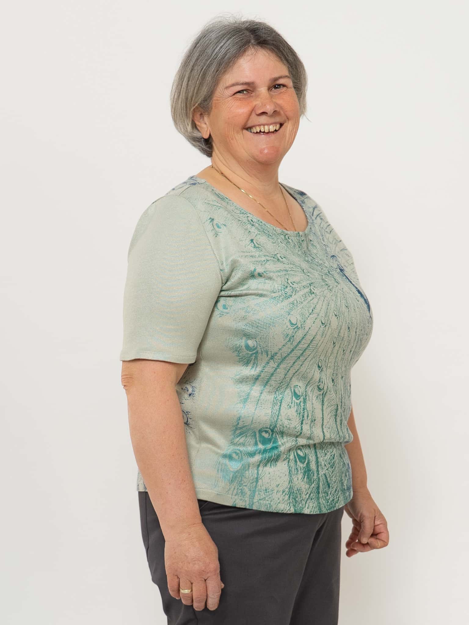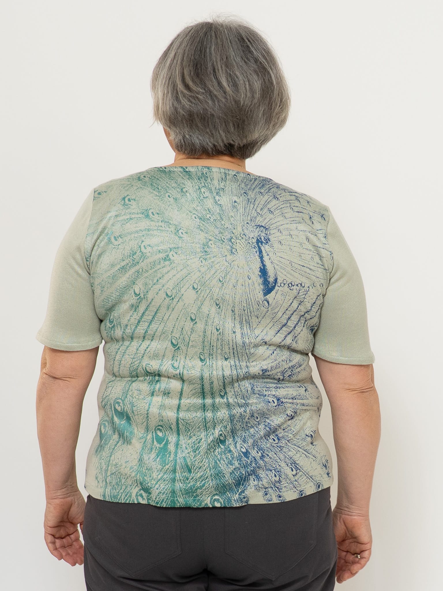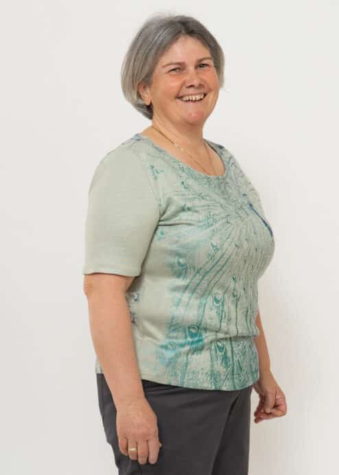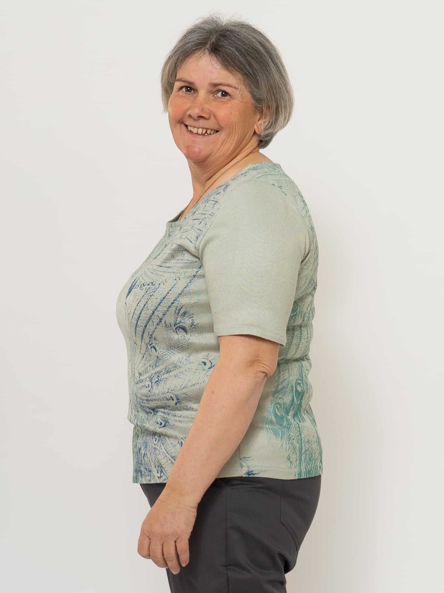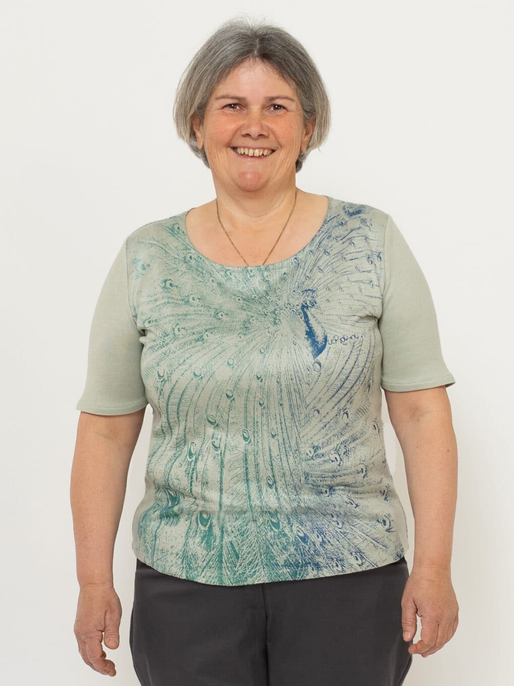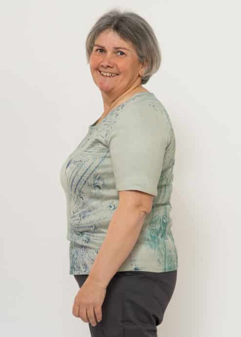 Dieser feine Pfauenpulli ist aus einem schönen Strickstoff aus Holz geschneidert. Der Siebdruck „Pfauenzauber“ von Susanne Huber ist in verschiedenen Blau-Grün Tönen gedruckt, deshalb kann der Pulli sehr gut kombiniert werden. Jedes Stück ist somit ein Unikat. Die Halbarm-Ärmel passen in jede Jahreszeit und können auch gut unter einer Weste getragen werden.