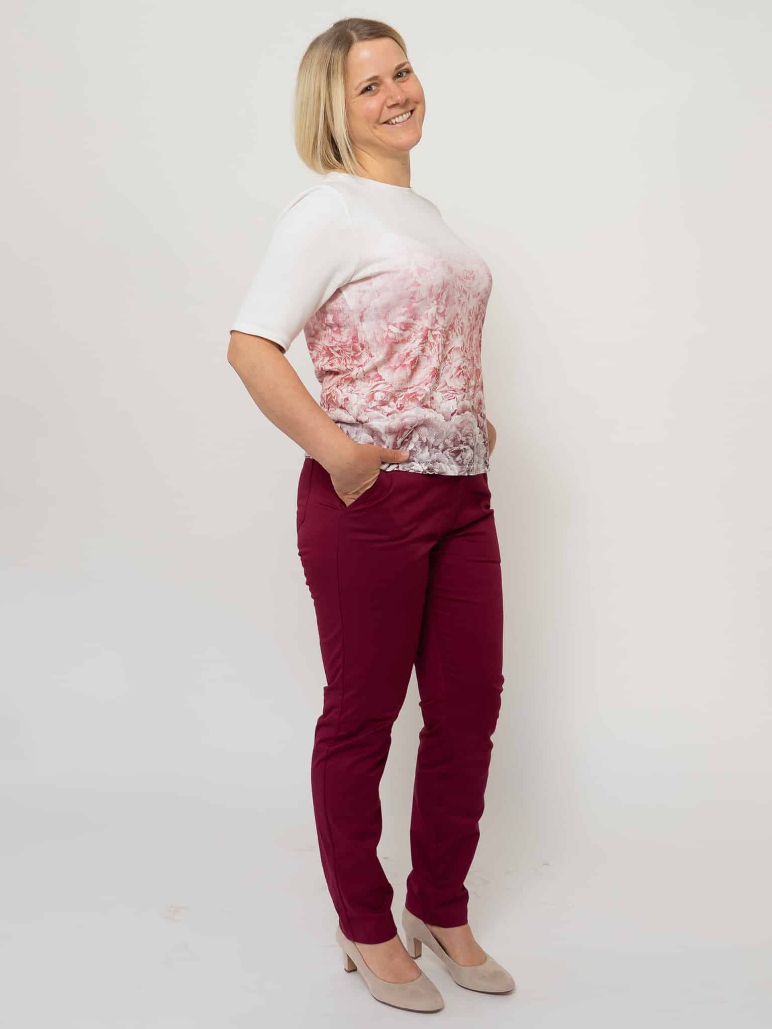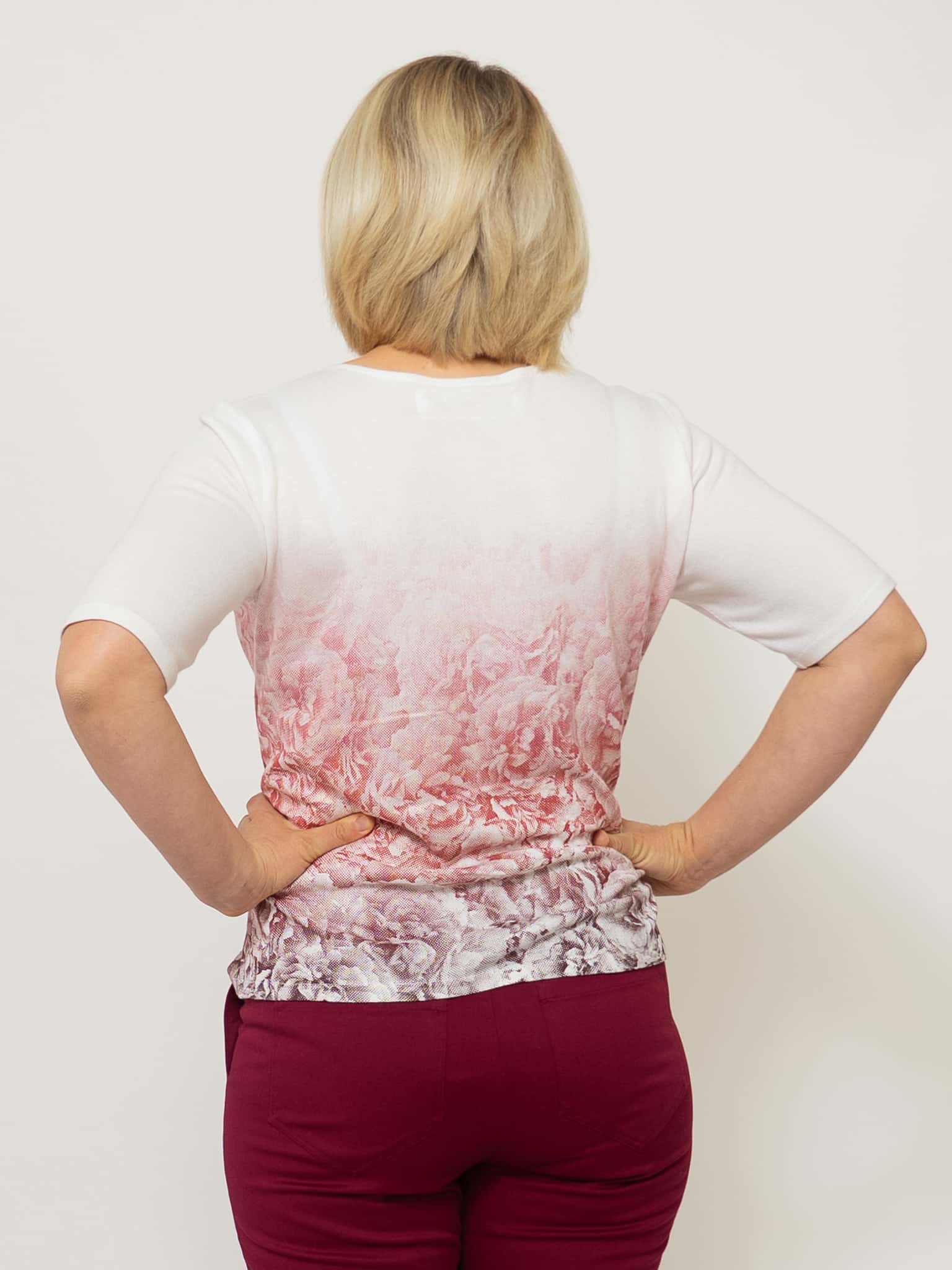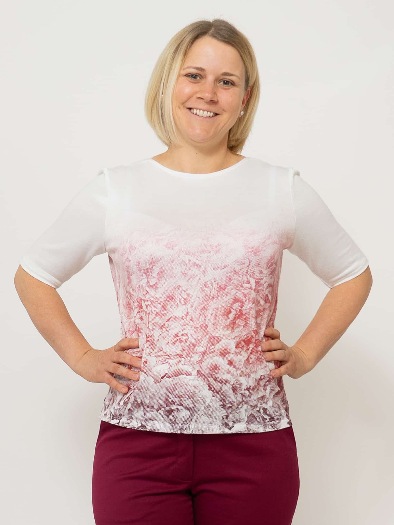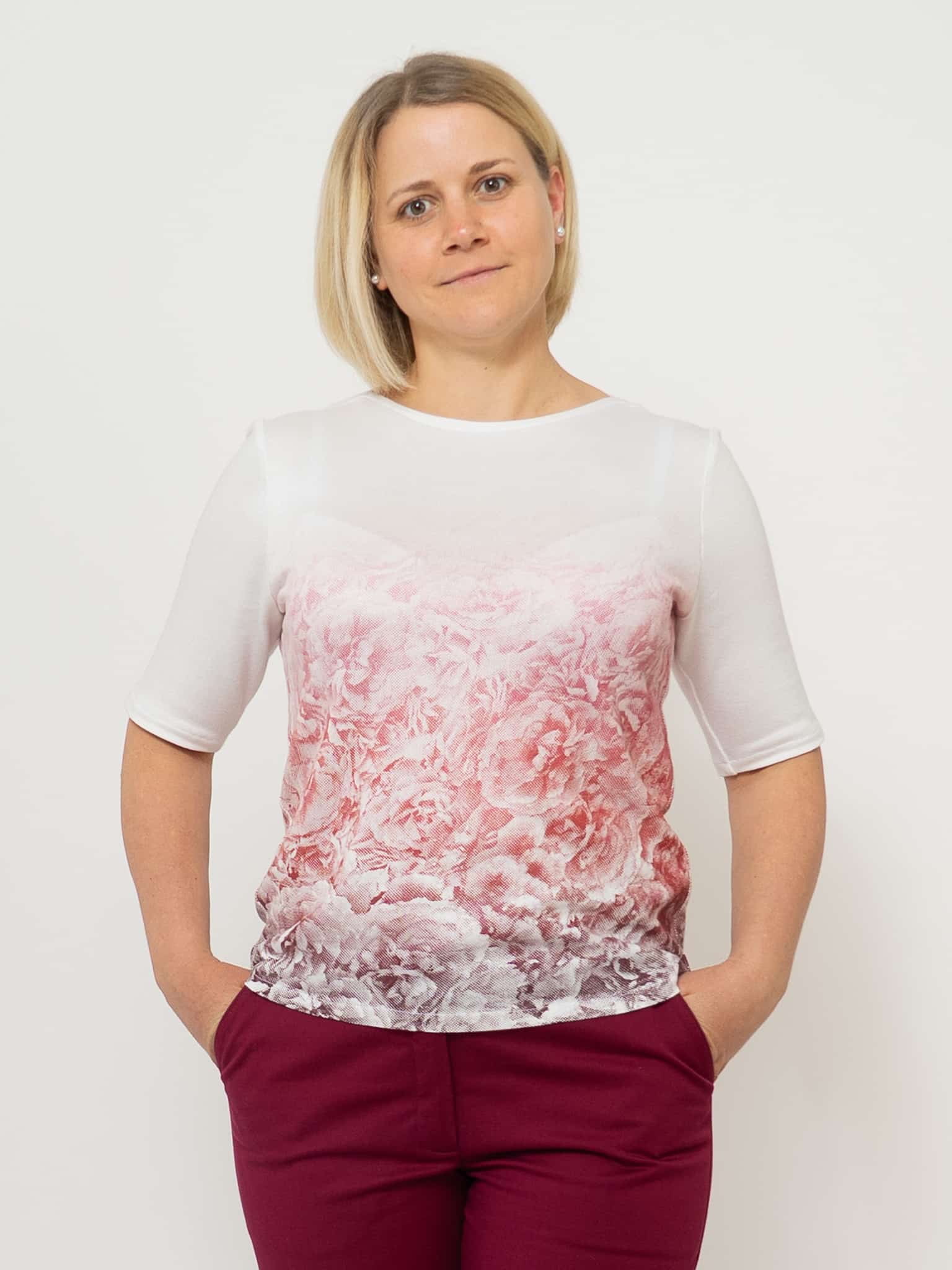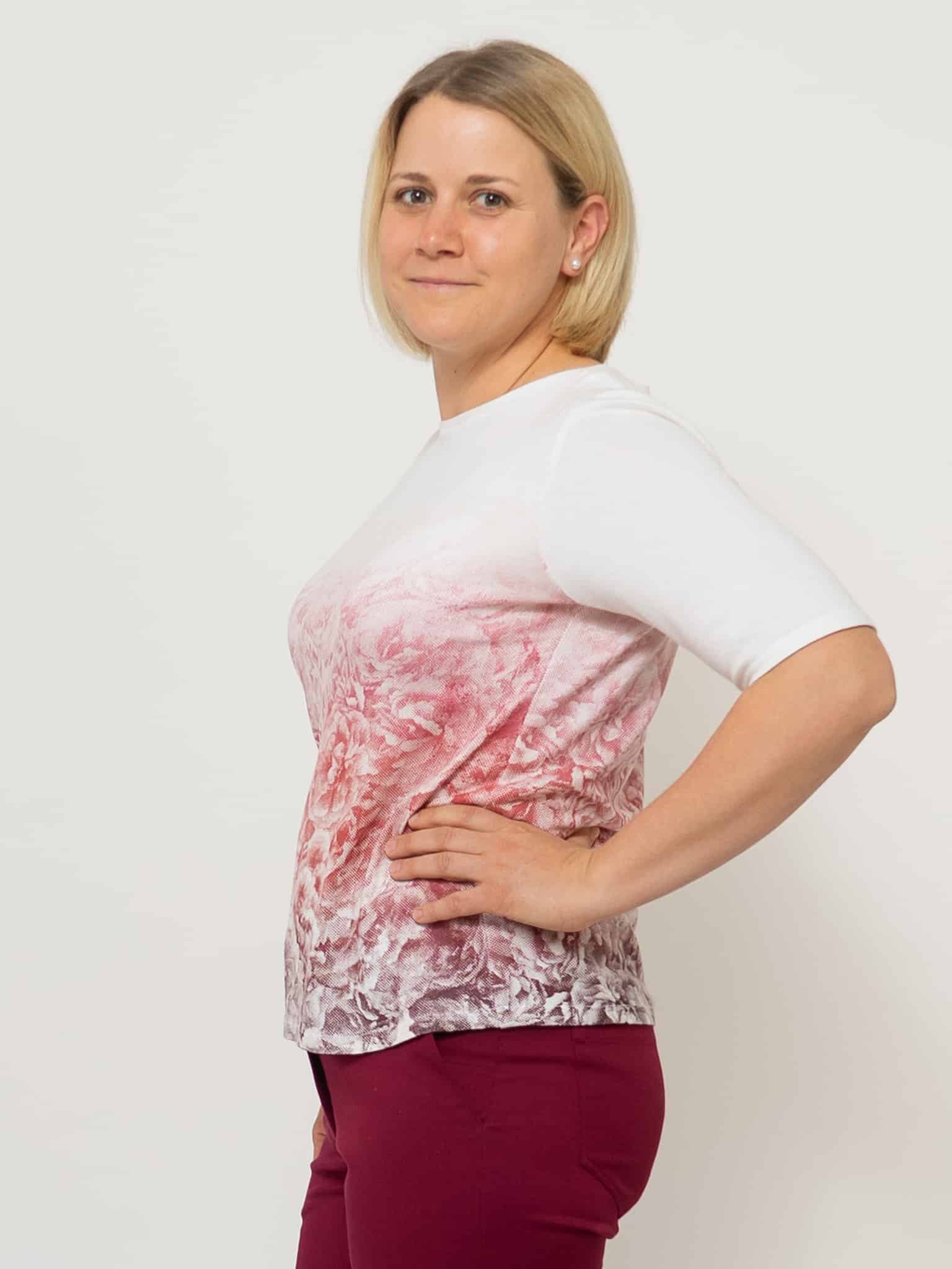 Dieser feine Rosennpulli ist aus einem schönen Strickstoff aus Holz geschneidert. Der Siebdruck „Rosengeheimnis“ von Susanne Huber ist in vielen verschiedenen Rot-Tönen gedruckt, deshalb kann der Pulli sehr gut kombiniert werden. Jedes Stück ist somit ein Unikat. Die Halbarm-Ärmel passen in jede Jahreszeit und können auch gut unter einer Weste getragen werden.