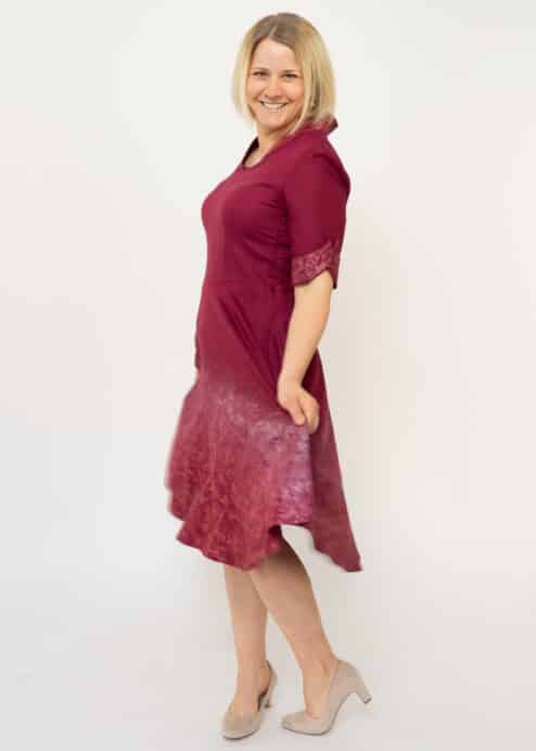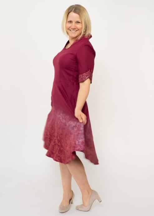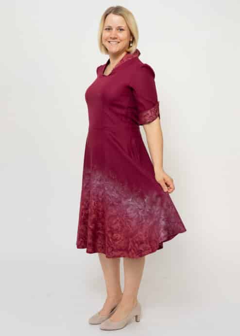 Man spürt die Freude in den Details von diesem festlichen Freude-Tanzkleid mit extravagantem Ärmelabschluss, seitlicher Tasche, breitem Gürtel und Stehkragen. Schön und elegant ist der Ausschnitt und der Stehkragen hat einen sehr eleganten Touch. Der Druck ist in verschiedenen Rot-Rosa-Bordeauxtönen und so wirken die Rosen recht lebendig. Der Crepé aus Holz fällt sehr schön und hat ein sehr angenehmes Tragegefühl.