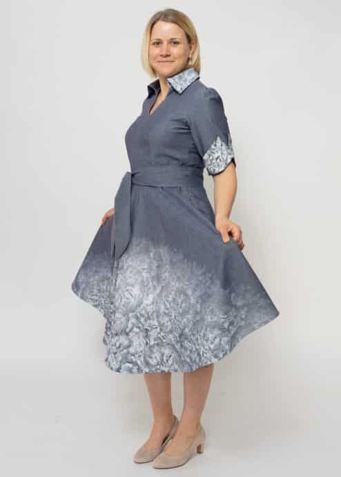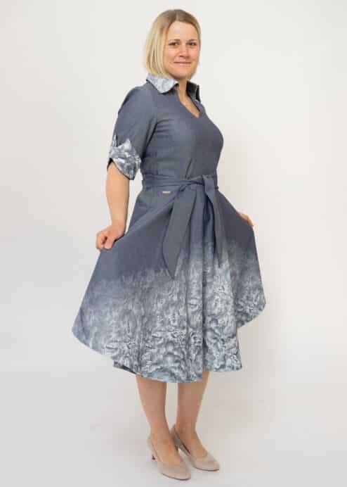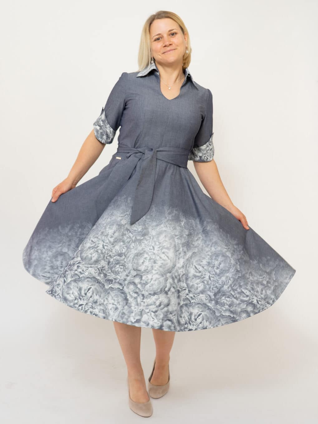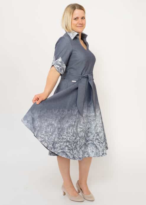 Man spürt die Freude in den Details von diesem festlichen Bio-Jeans-Tanzkleid mit extravagantem Ärmelabschluss, seitlicher Tasche und breitem Gürtel. Schön und elegant ist der Ausschnitt und der Legekragen lässt sich auch aufstellen – je nach Anlass und Frisur. Der Druck ist in Weiß-Cremetönen gestaltet und die üppigen Rosen kommen so sehr mystisch zur Geltung. Der Bio-Jeansstoff ist von C.Pauli und hat eine sehr gute Qualität.