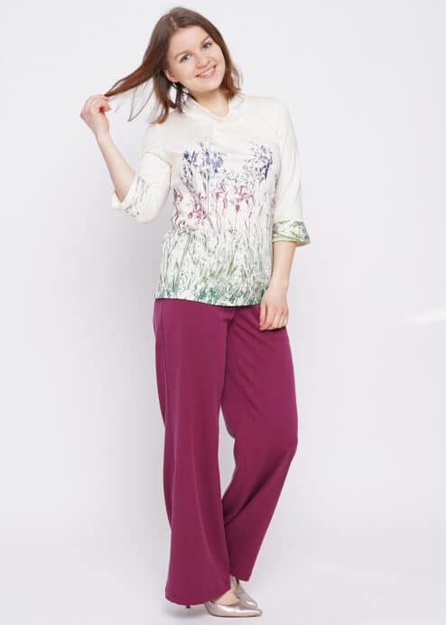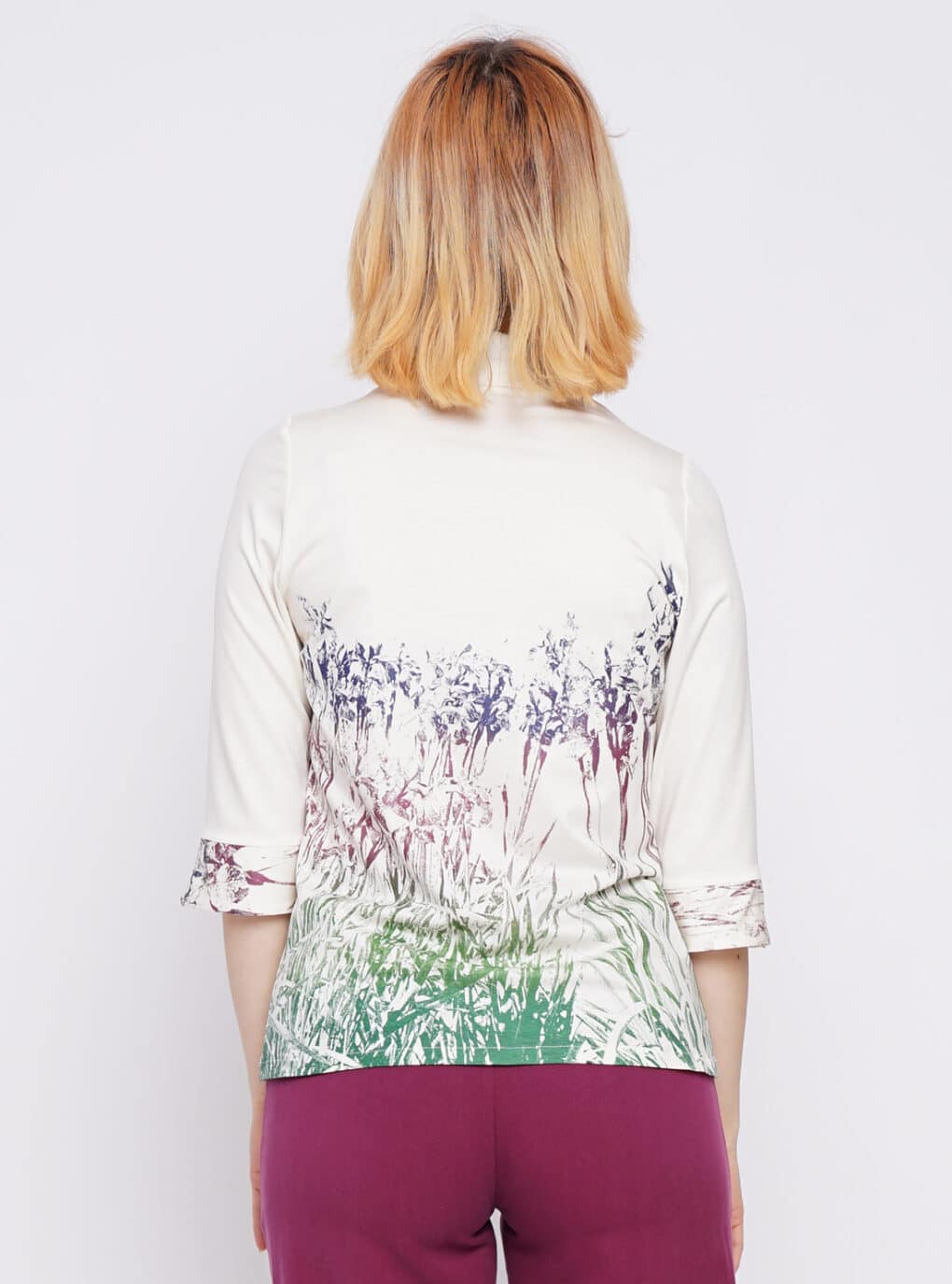 Diese hübsche Bluse aus nachhaltiger und sehr angenehm zu tragender TENCEL™ Holzfaser wirkt durch den farbenprächtigen Kunstdruck “Mystic Iris“ besonders stilvoll.