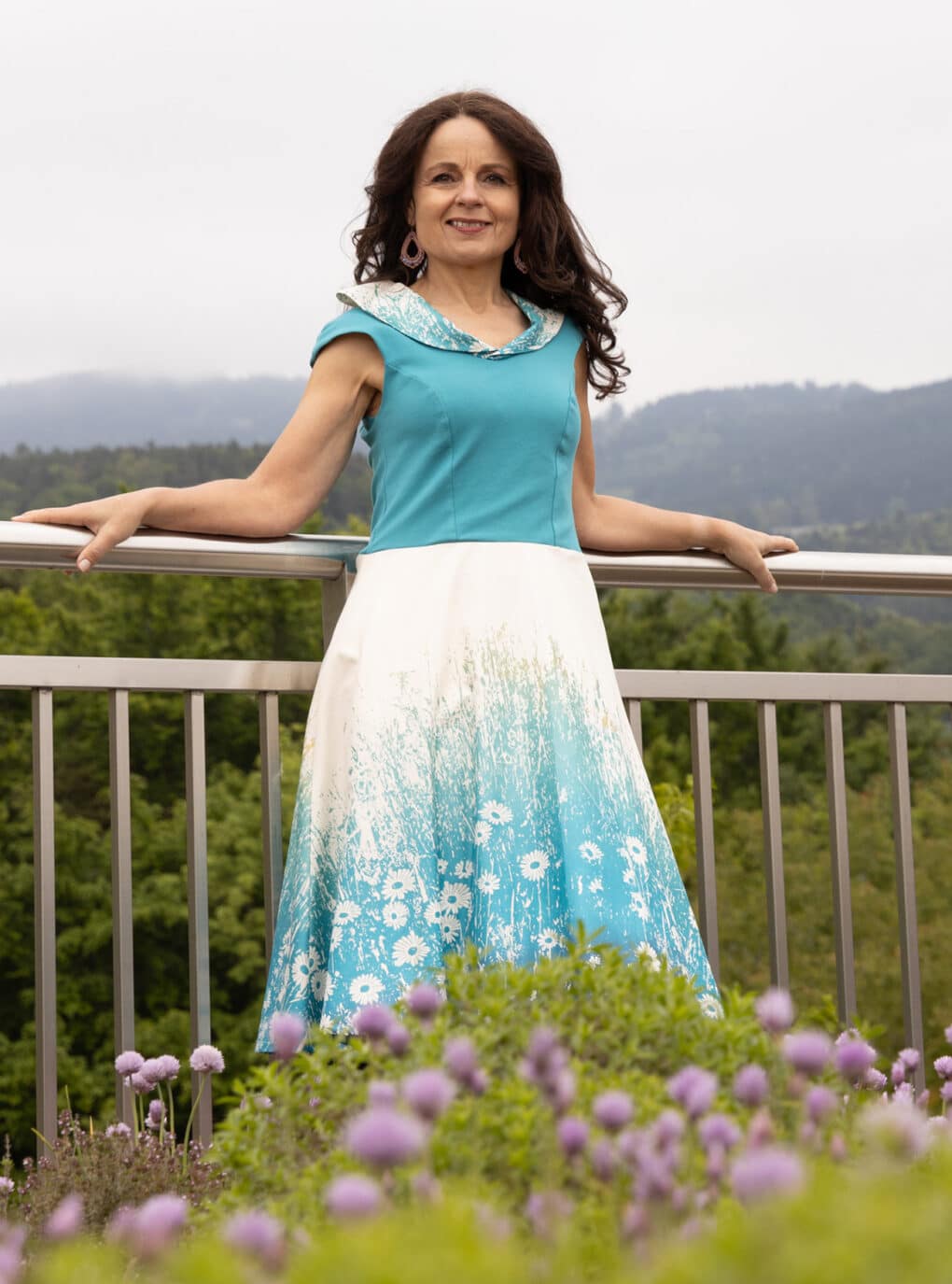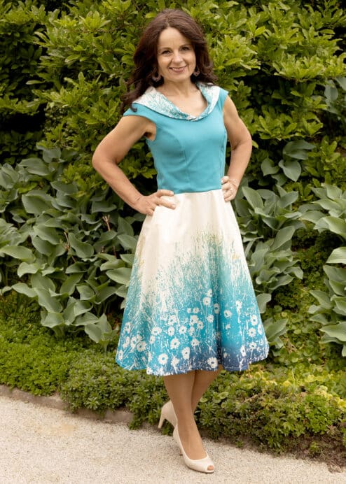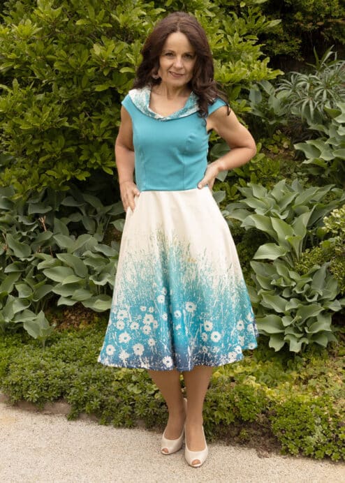 Der türkise Oberteil des Kleides besteht aus feiner Bio Baumwolle mit einem kleinen Anteil von Elasthan – sehr angenehm zu tragen, passt sich der Stoff dem Körper schön an. Bedruckt wird der Stoff mittels Siebdrucks von Hand, gefertigt wird das schöne Kleid in unserem Kleiderkunst.Atelier im Herzen von Graz.
