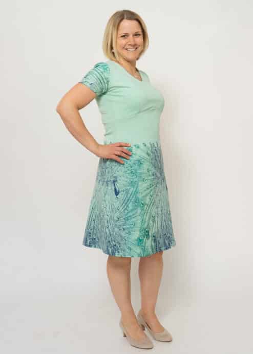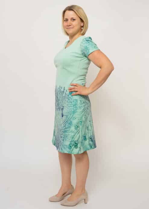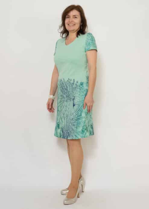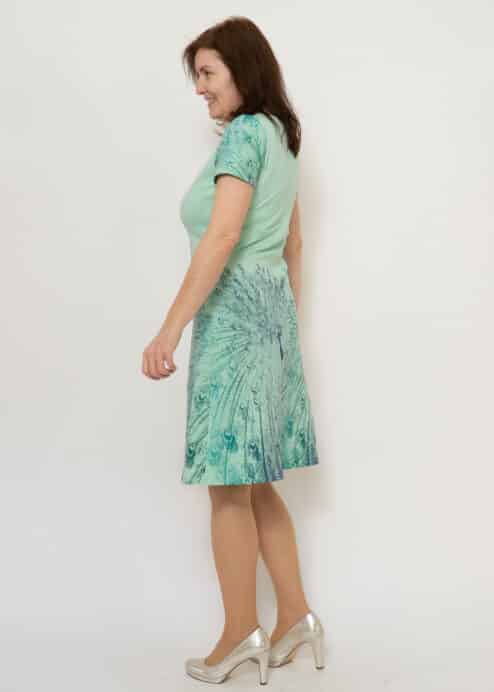 Ein bequemes Jerseykleid mit einem Pfau, der sich in einem Farbverlauf von Königsblau über Smaragd bis zu Türkistönen ausdrückt.