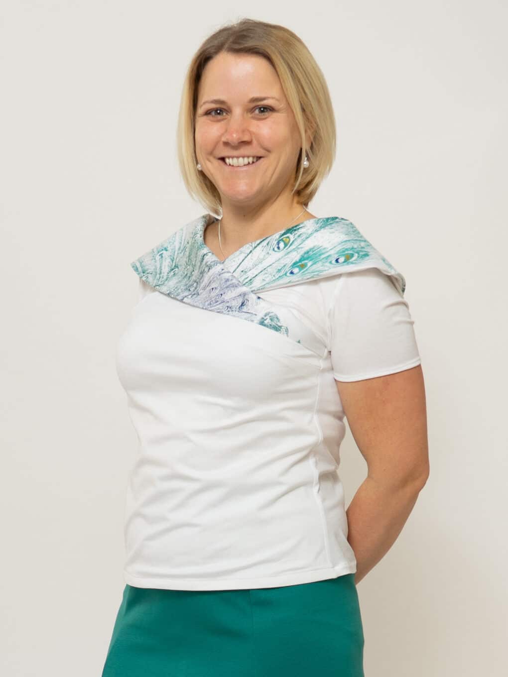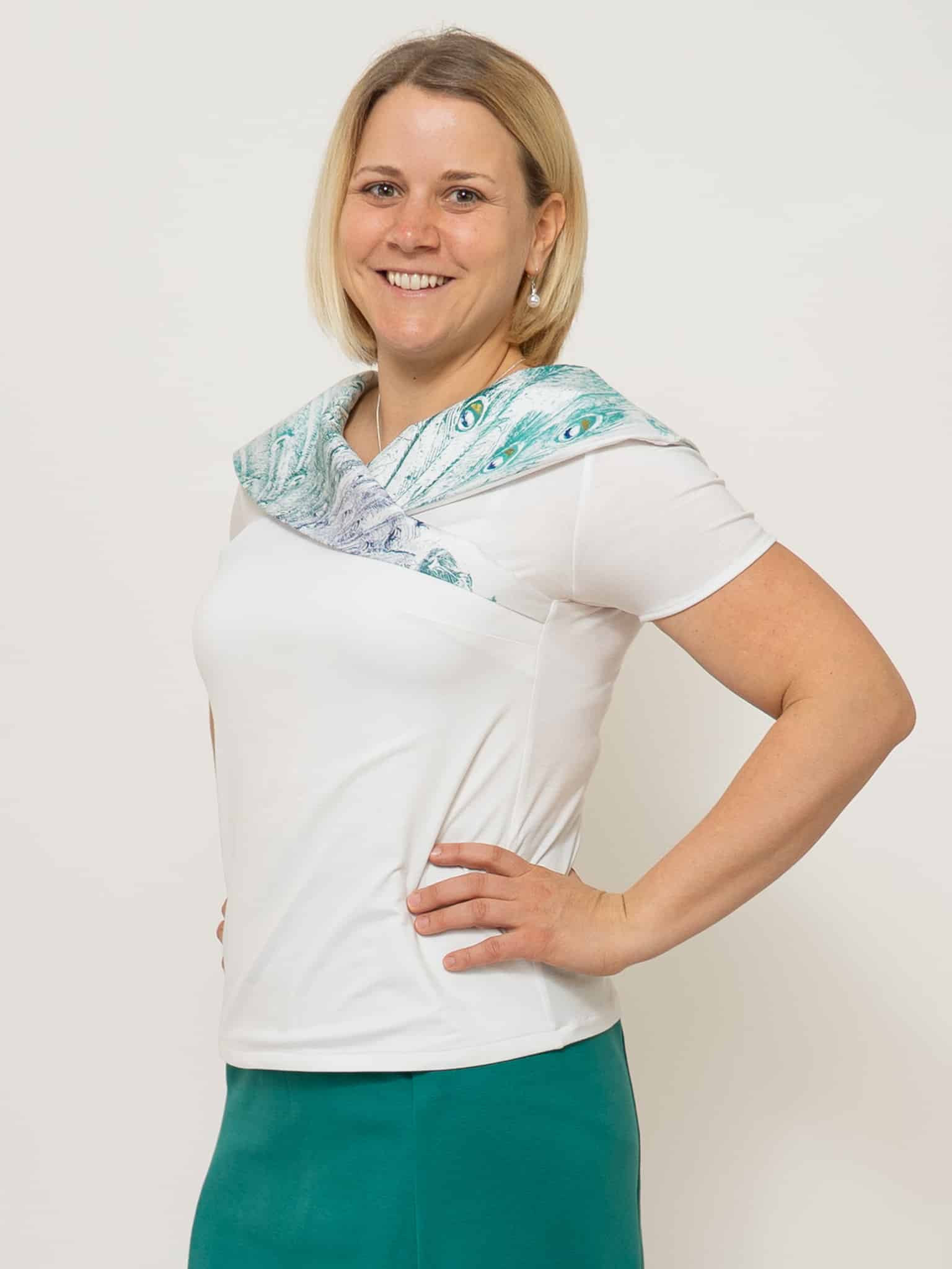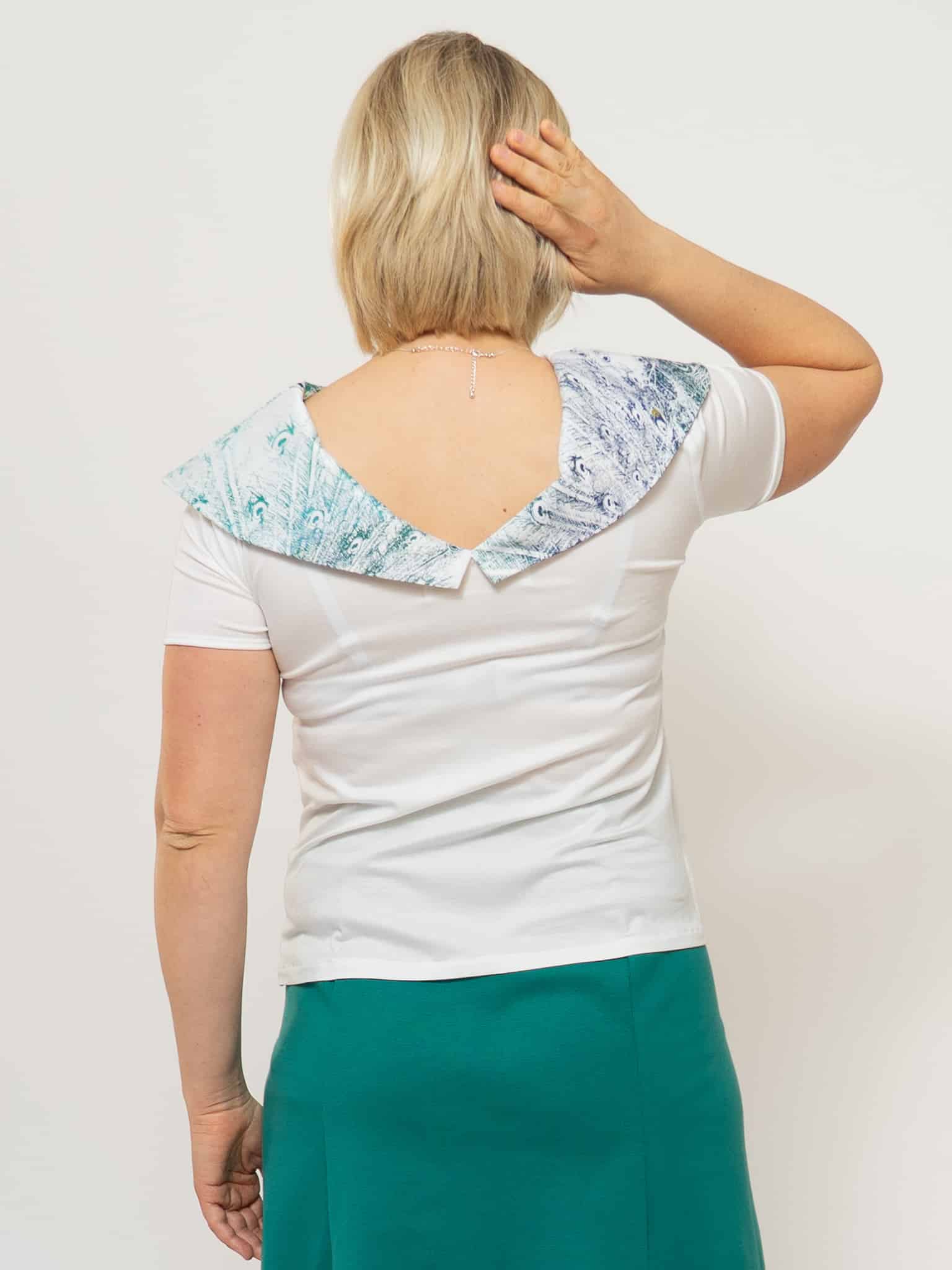 Ein zartes Shirt mit zauberhaftem Portraitkragen, der in schönen Blau-Smaragd-Türkistönen bedruckt ist. Ein elegantes Basic welches sich toll zu Hosen oder Röcken kombinieren lässt. Das Shirt hat kurze Ärmel.