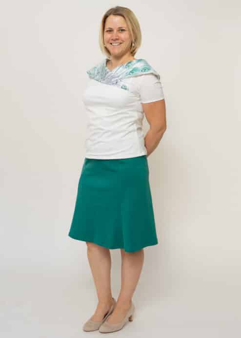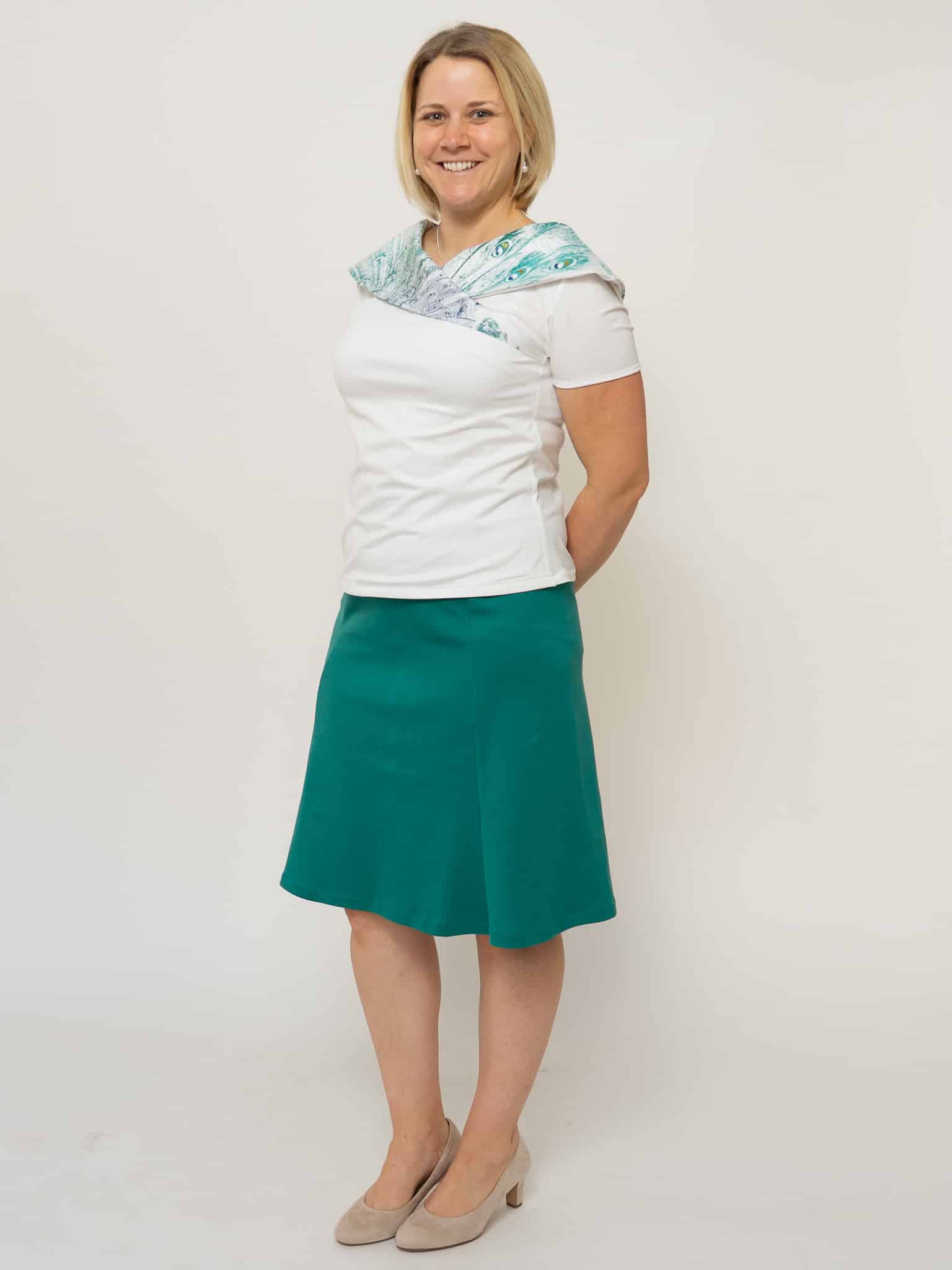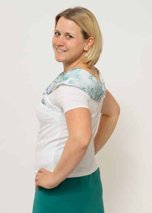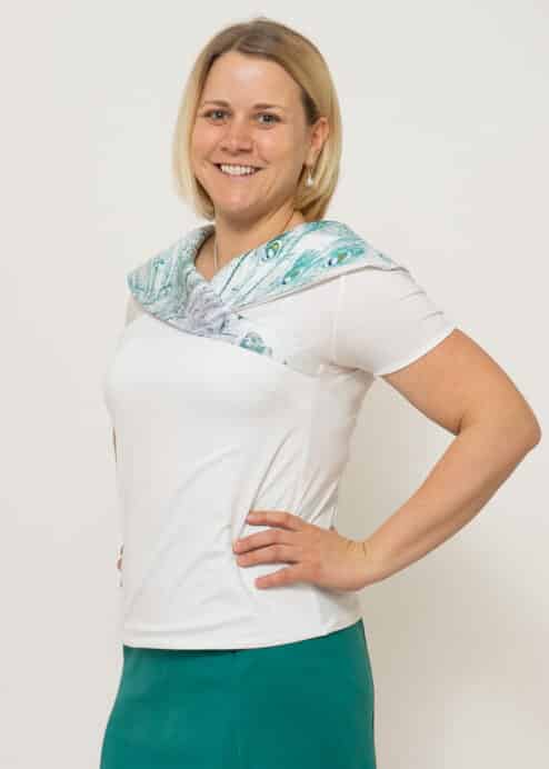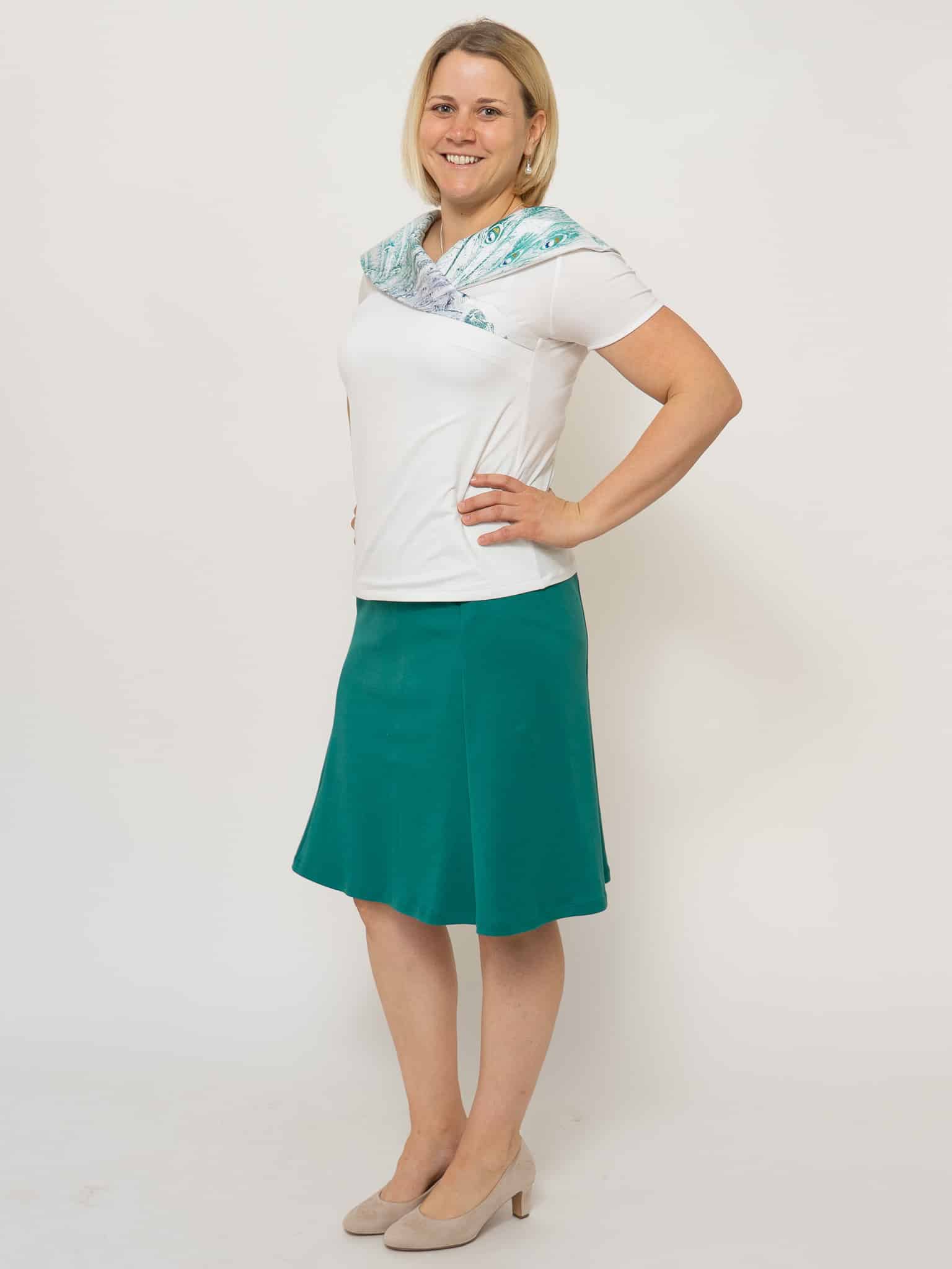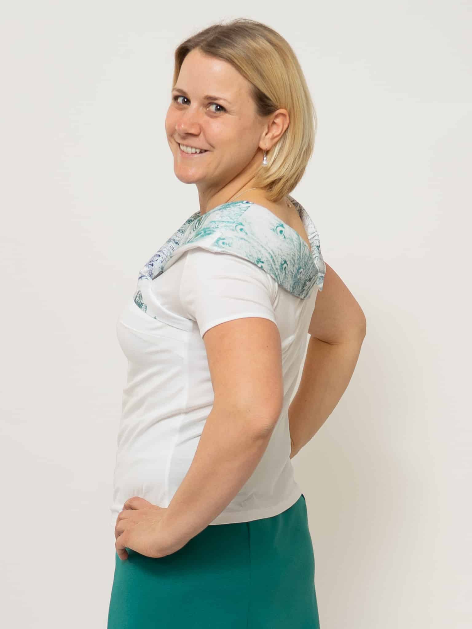 Ein zartes Shirt mit zauberhaftem Portraitkragen, der in schönen Blau-Smaragd-Türkistönen bedruckt ist. Ein elegantes Basic welches sich toll zu Hosen oder Röcken kombinieren lässt. Das Shirt hat kurze Ärmel.