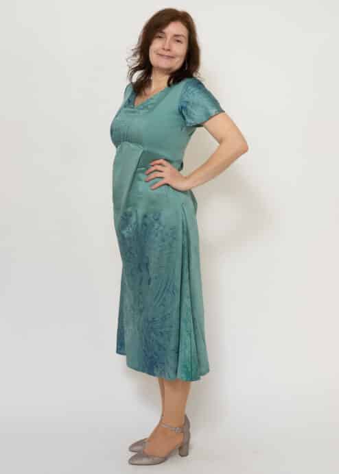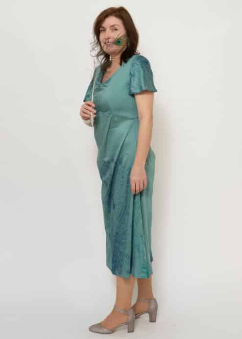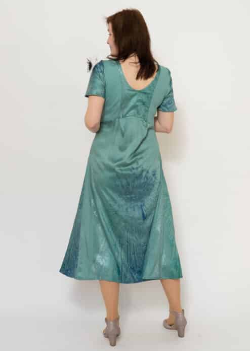 Edles Sommer oder Abendkleid aus feinem, seidig glänzenden Seidenersatz aus Holz von C.Pauli. Die Seitenteile des Oberteils sind aus Bio-Baumwoll-Jersey gefertigt, daher trägt sich das Kleid sehr angenehm und passt sich gut der Figur an – der glockige Schnitt des eleganten Rockteiles fällt besonders schön und ladet zum Tanzen ein. Locker, leichte Ärmel zaubern einen Hauch von Sommer auf dieses elegante Sommerkleid. Der Siebdruck mit einem Pfau in silbrig-türkis-Blau-Tönen wirkt sehr lebendig, strahlend und elegant.