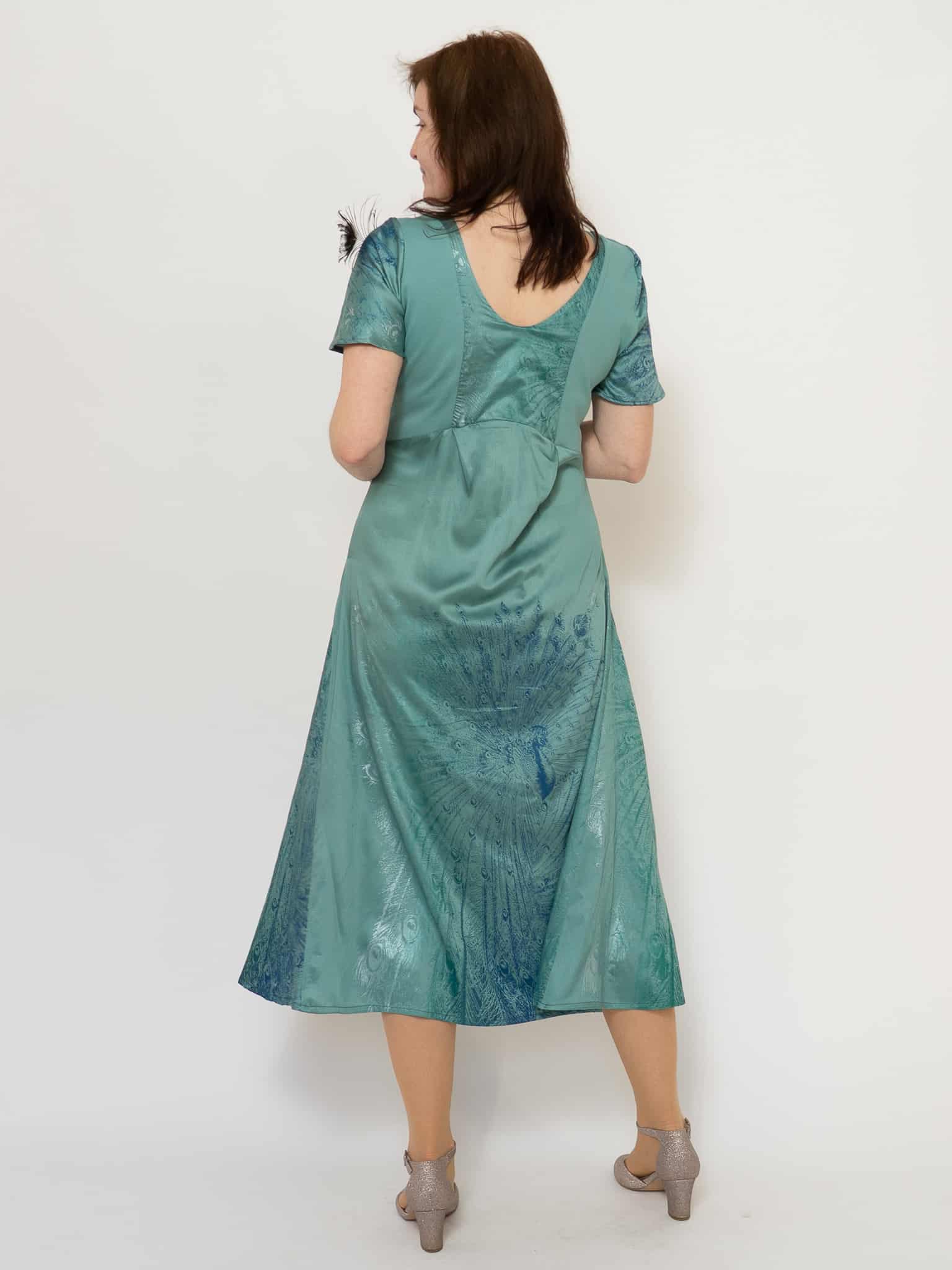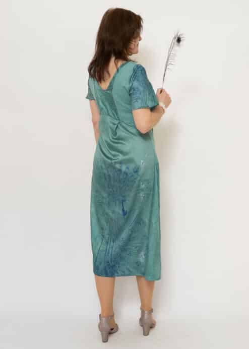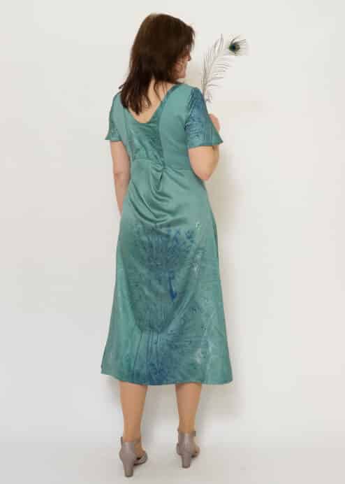 Sehr feines, elegantes und trotzdem bequemes Kleid aus edlem Satin mit dem neuen Pfauenzauber-Siebdruck