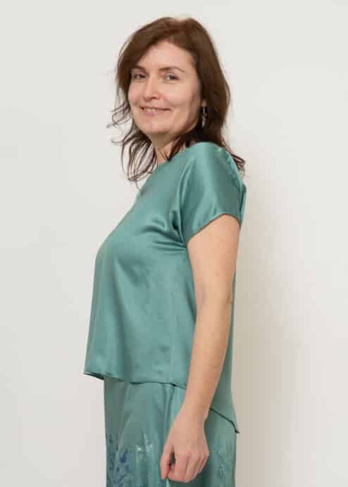 Raffiniert und doch einfach ist der Schnitt dieses feinen Shirts aus glänzendem „Seidenersatz“ aus feinem Ecovero Rayon Satin von C.Pauli. Der Schnitt ist locker leger mit angeschnittenen, kurzen Ärmeln.