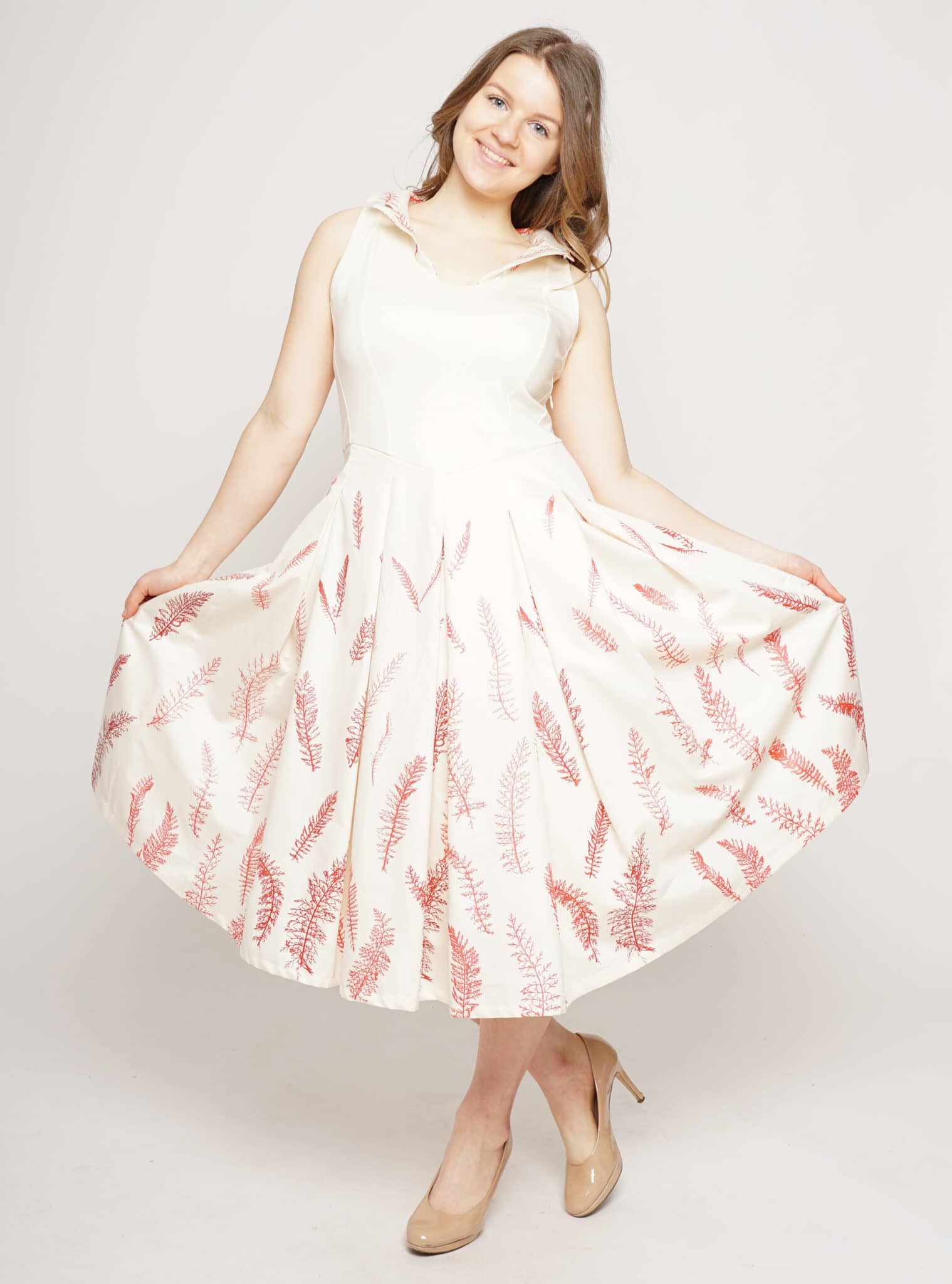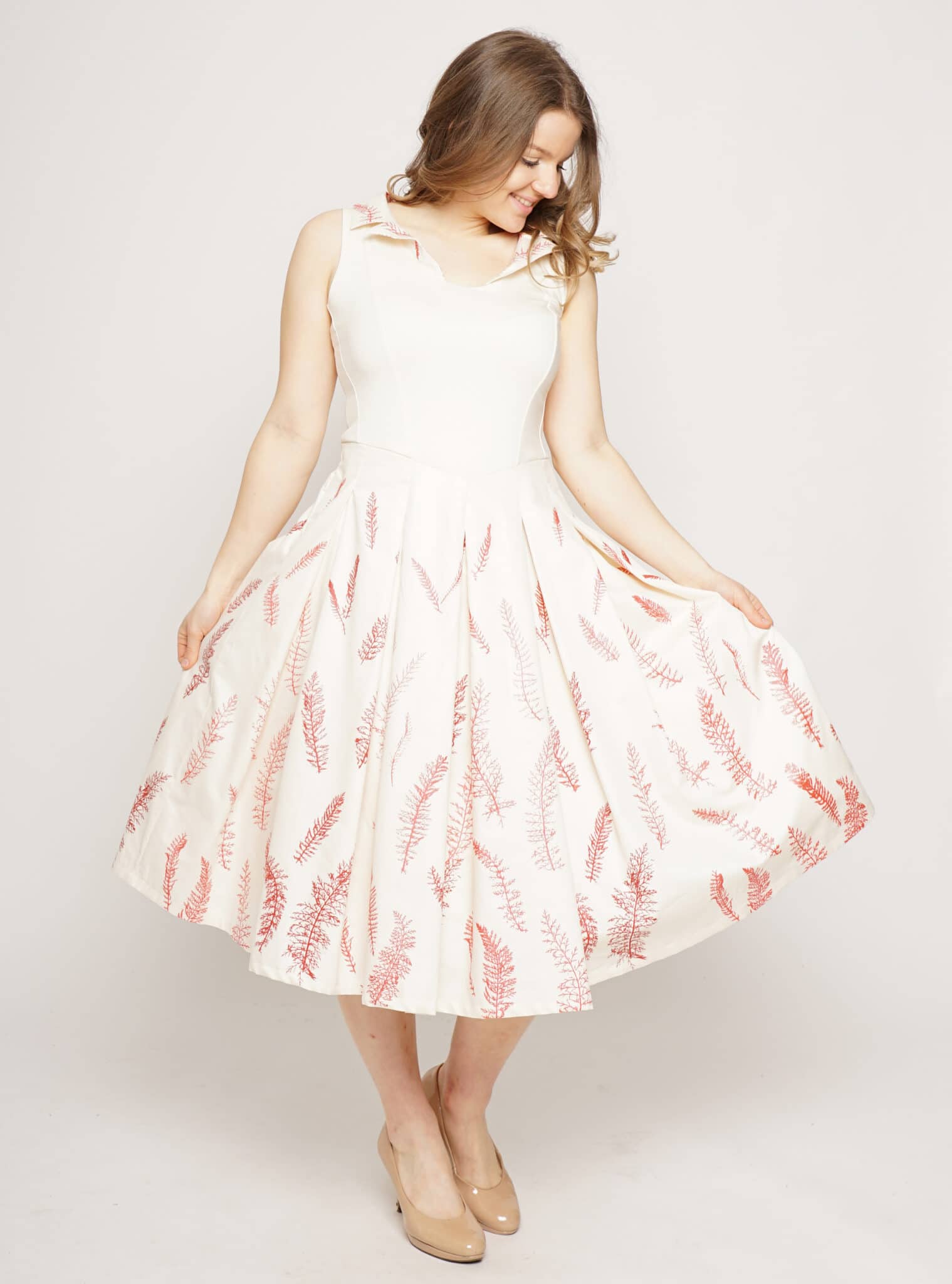 Ein besonders schönes, sommerliches Kleid, das auch als Hochzeitskleid getragen werden kann. Bedruckt ist es mit dem Kunstdruck zarter Schafgarbenblätter in einem kräftigen Rot-Orange-Farbverlauf.