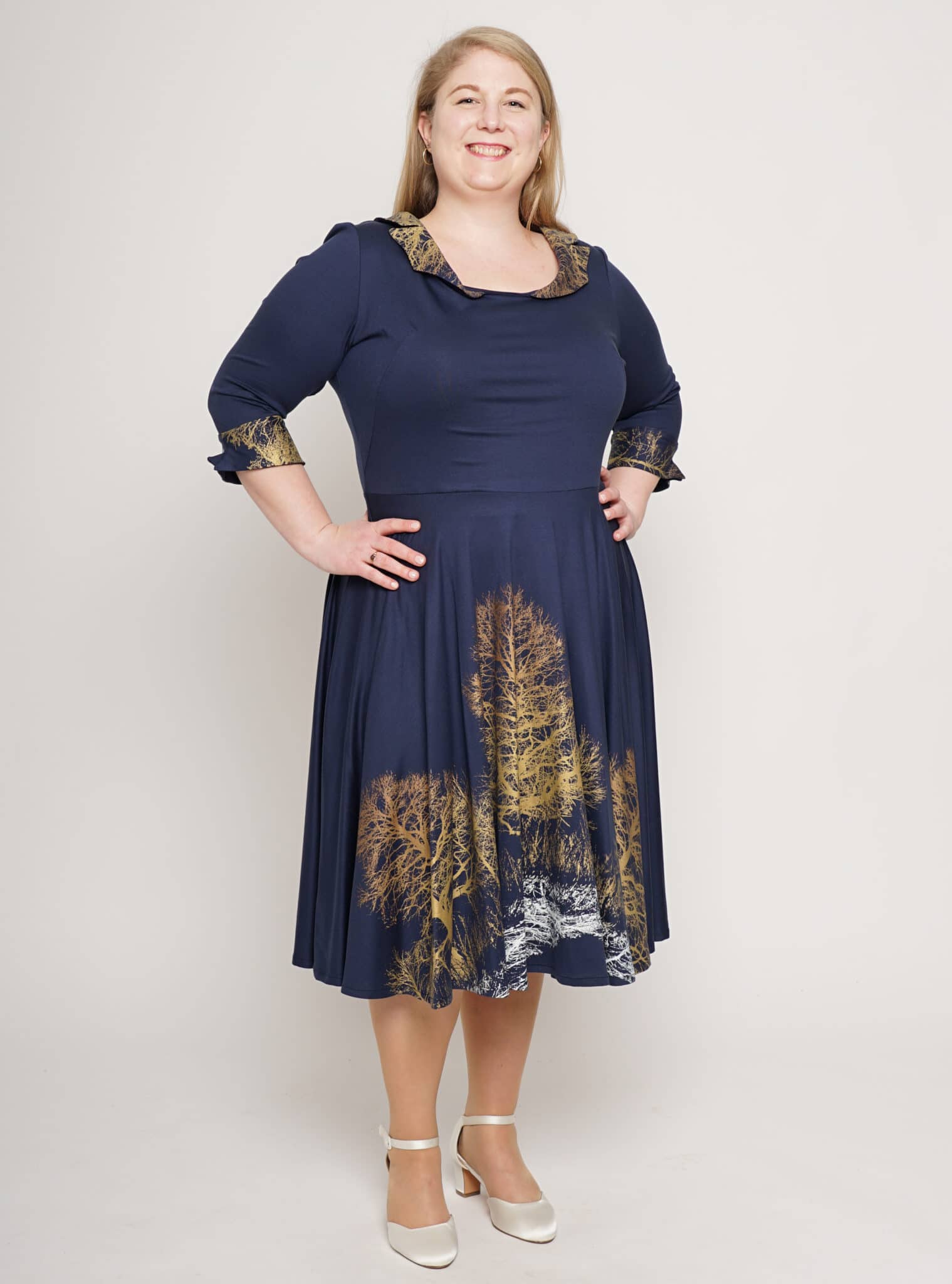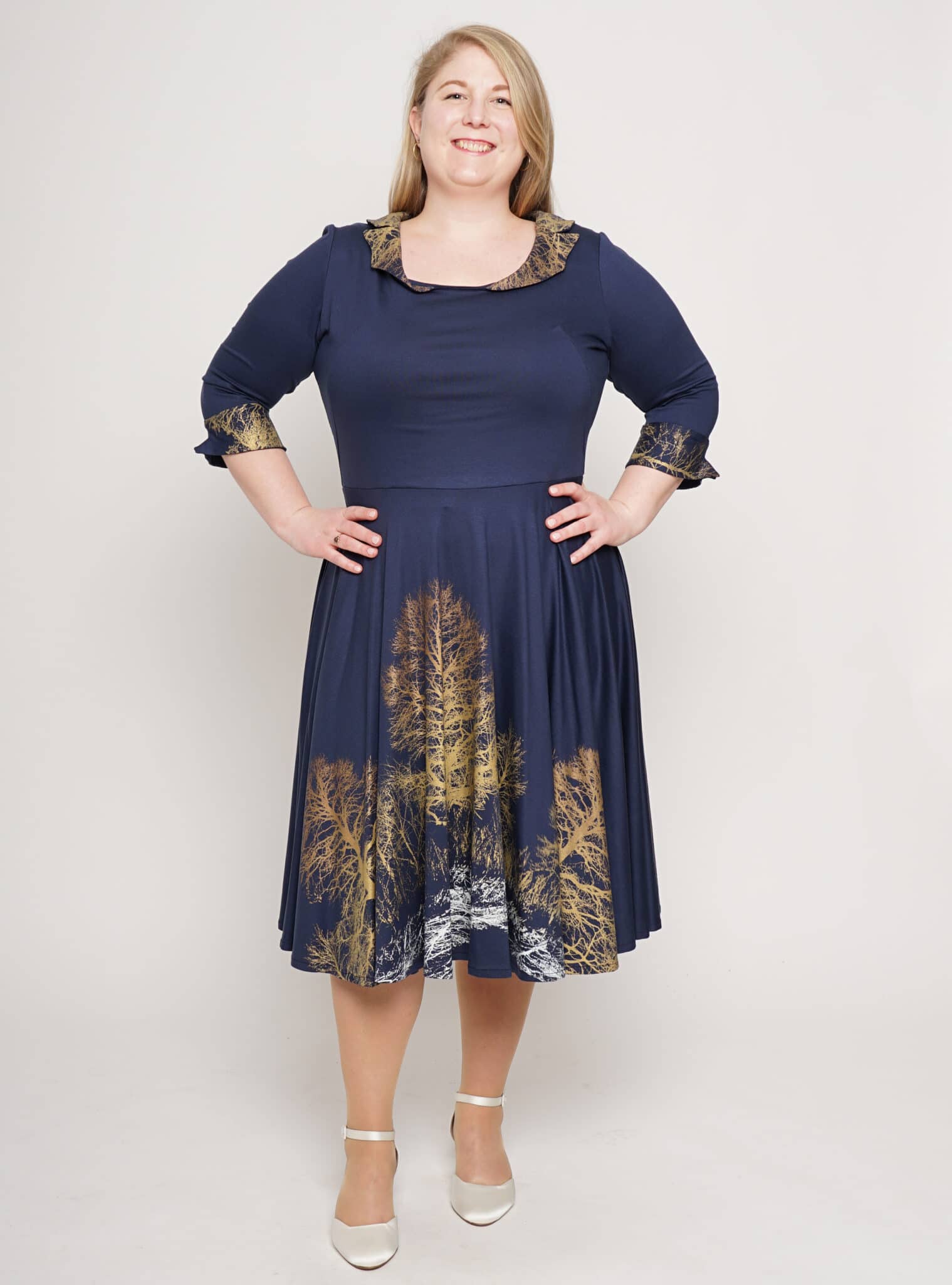 Besonders elegant wirkt dieses Festkleid mit Reverskragen auf diesem exklusiven Stoff in Nachtblau mit dem Kunstdruck aus der Hand von Susanne Huber. Der Kragen mit dem gold-braunen Kunstdruck und die Armmanschetten lassen das Kleid besonders exklusiv wirken.Der Tellerrock lädt zum Tanzen ein und umschmeichelt sanft den Körper.