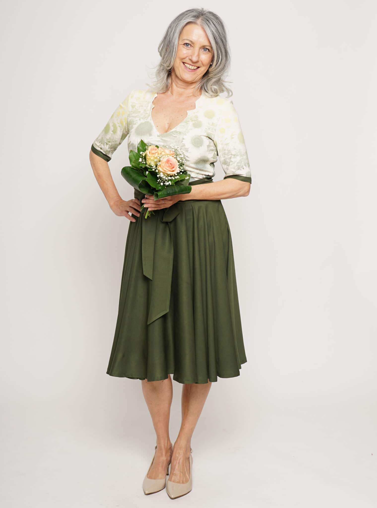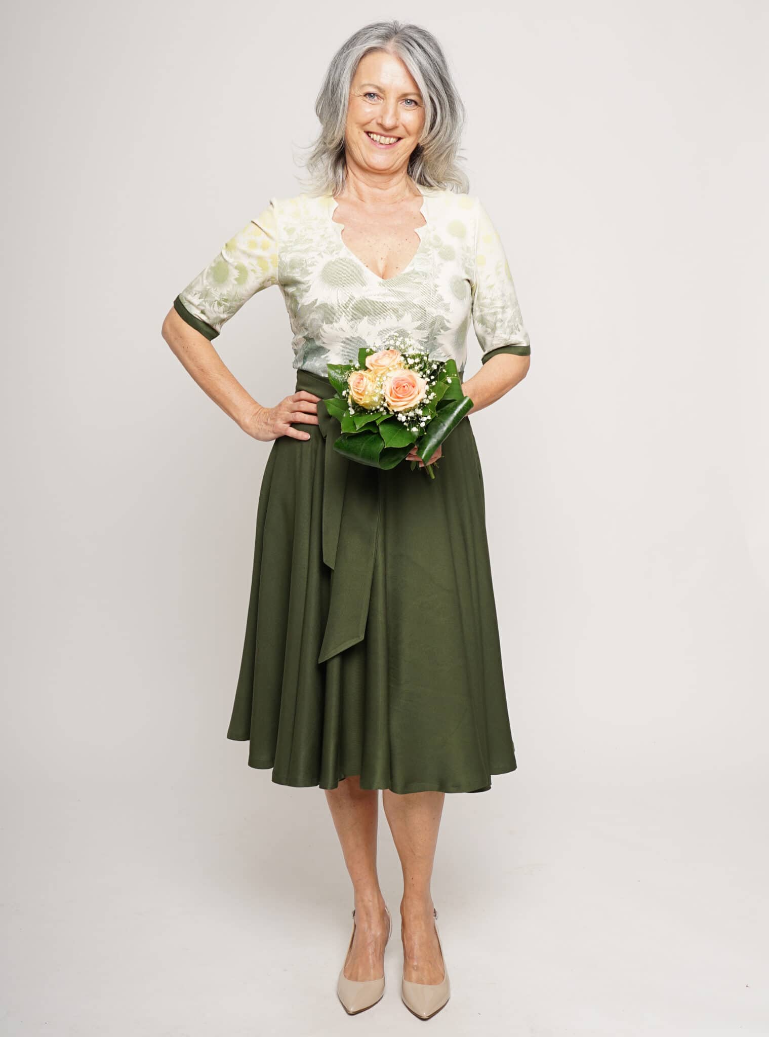 Der Rockteil des Kleides ist aus einem besonders weich fallendem und schön glänzendem Holzfaser-Stoff von Mind the Maker  (100% Lenzing® Ecovero® Holzfaser) gefertigt.