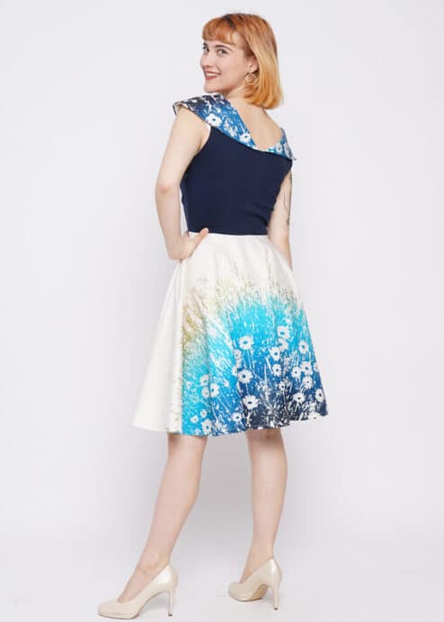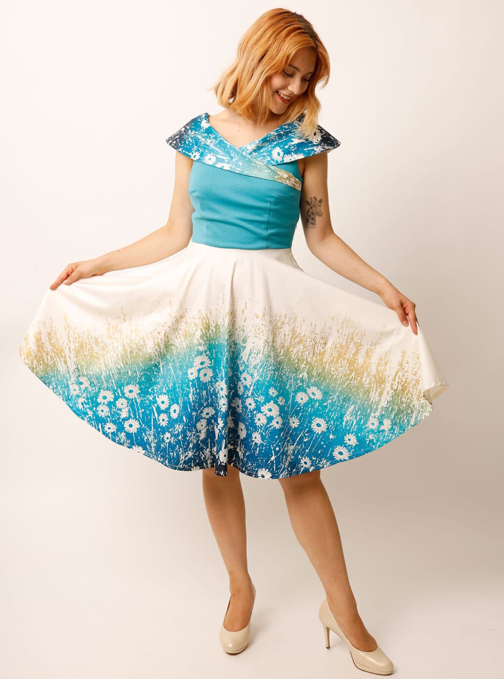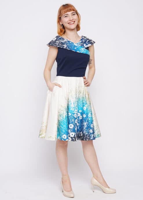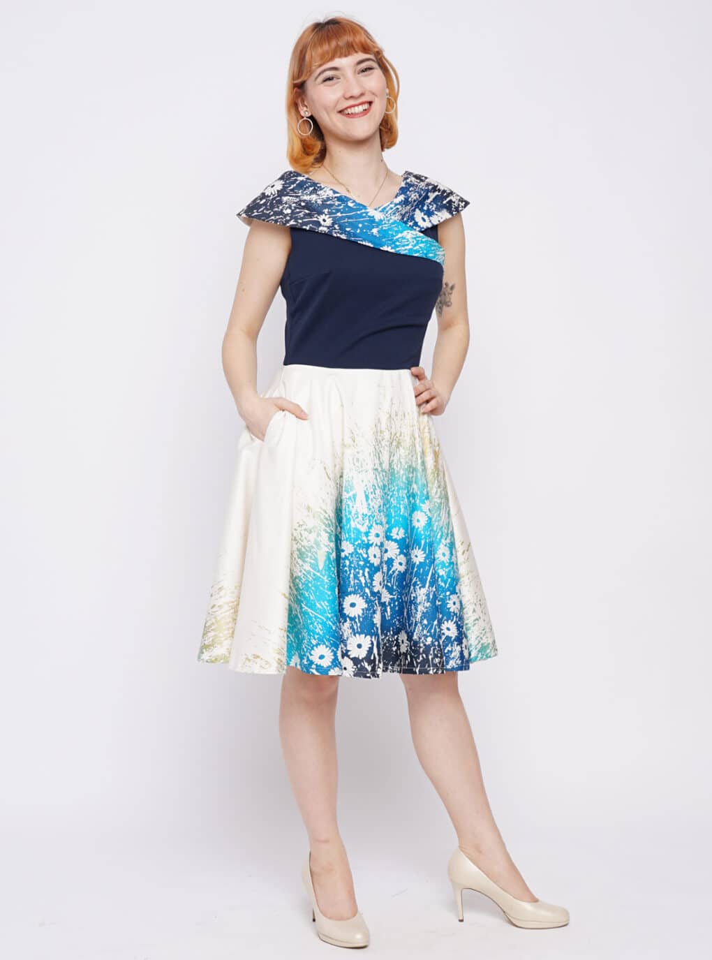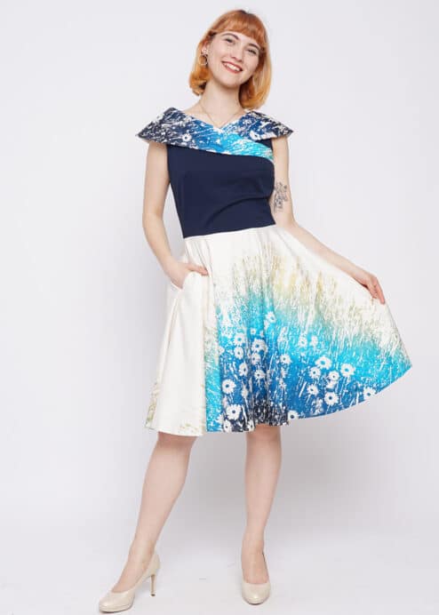Dieses wunderschöne Kleid mit bedrucktem Portrait-Ausschnitt und schwingendem Rockteil besticht durch sein einzigartiges Design. Das Motiv „Wiesengemälde“ in Dunkelblau-Türkis-Gold-Verlauf kommt durch den stilvollen Schnitt des Naturkleides besonders schön zur Geltung. Das Kleid kann je nach Vorliebe entweder mit türkisem Oberteil oder in Navy gefertigt werden. In beiden Variationen ist dieses Festkleid etwas ganz Besonderes.