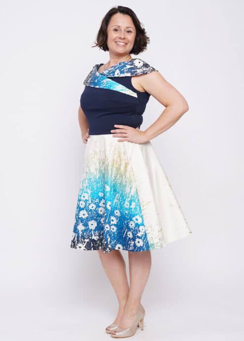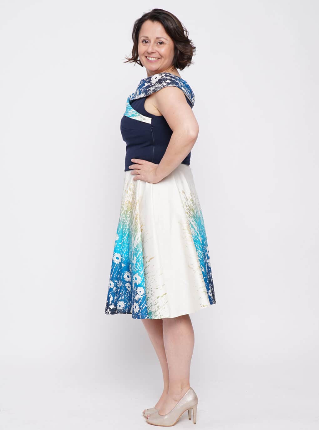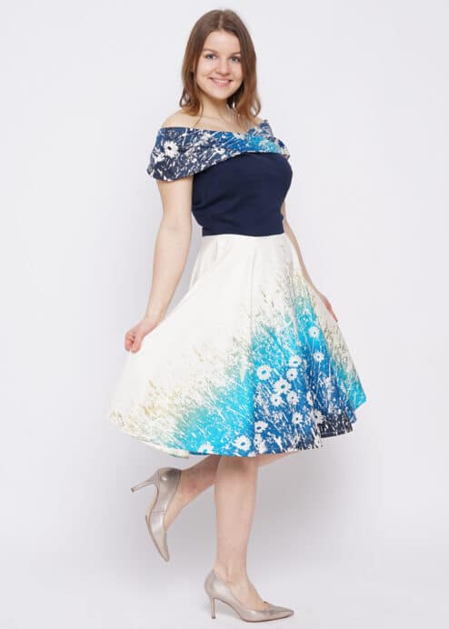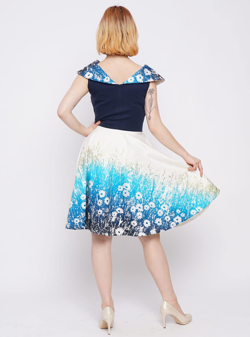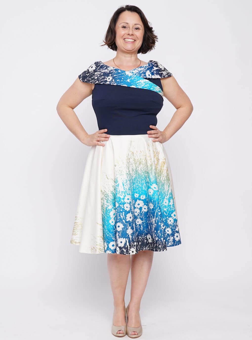 Dieses wunderschöne Kleid mit bedrucktem Portrait-Ausschnitt und schwingendem Rockteil besticht durch sein einzigartiges Design. Das Motiv „Wiesengemälde“ in Dunkelblau-Türkis-Gold-Verlauf kommt durch den stilvollen Schnitt des Naturkleides besonders schön zur Geltung. Das Kleid kann je nach Vorliebe entweder mit türkisem Oberteil oder in Navy gefertigt werden. In beiden Variationen ist dieses Festkleid etwas ganz Besonderes.