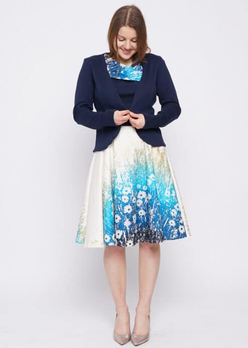 Der Oberteil des Kleides besteht aus Biobaumwolle mit einem kleinen Anteil von Elasthan – sehr angenehm zu tragen, passt sich der Stoff dem Körper schön an. Das Motiv „Wiesengemälde“ hat Susanne Huber aus einem Foto kreiert. Es zeigt eine artenreiche Wiese und soll auf die Wichtigkeit von Artenvielfalt und den Fortbestand zahlreicher Wiesenbewohner hinweisen. Bedruckt wird der Stoff mittels Siebdrucks von Hand, gefertigt wird das schöne Kleid in unserem Kleiderkunst.Atelier im Herzen von Graz.