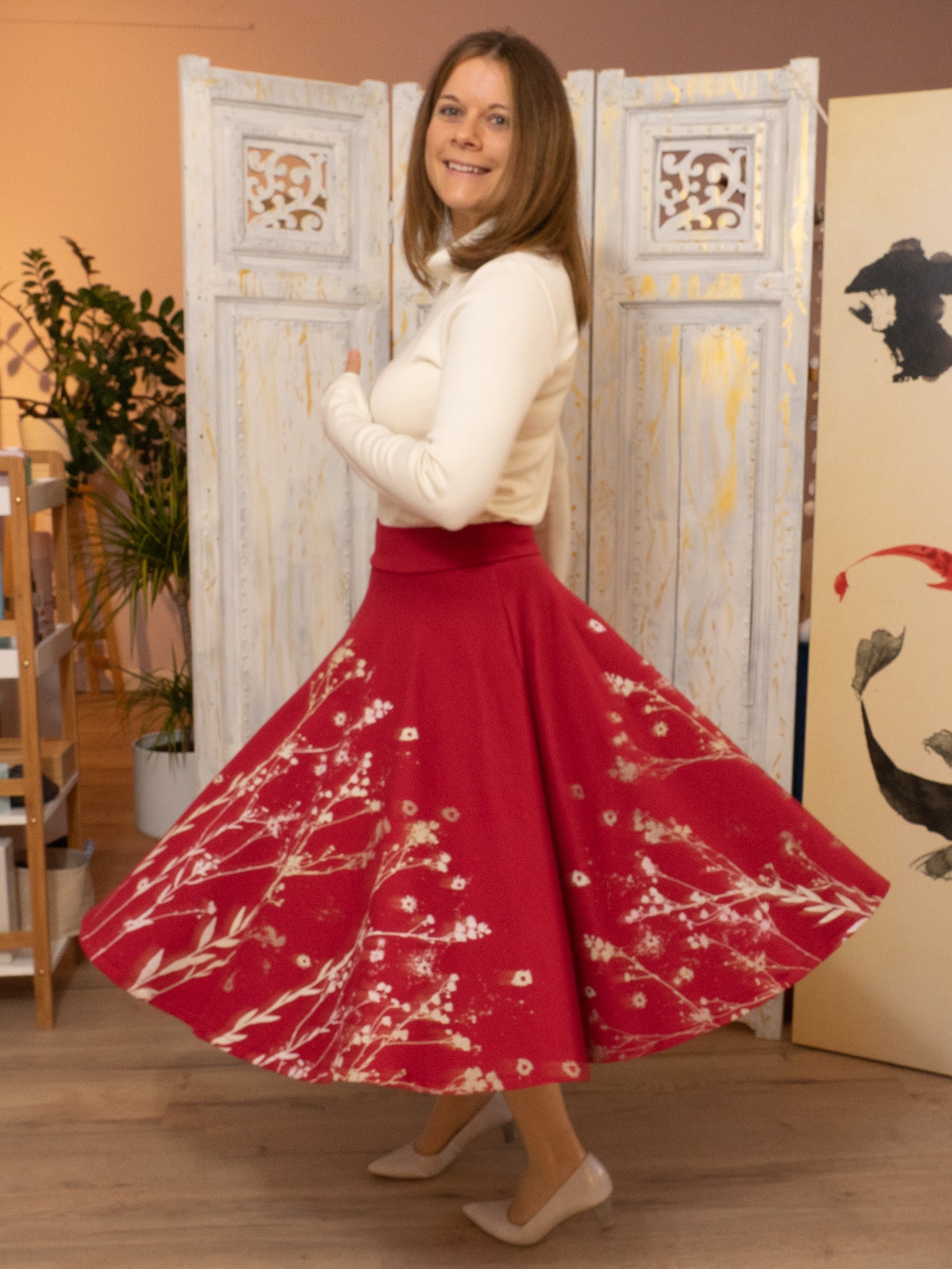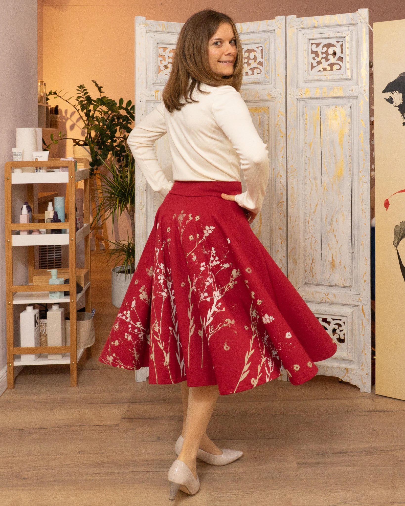 Festlicher Tellerrock in lebendigem Rot mit zarten Blüten
