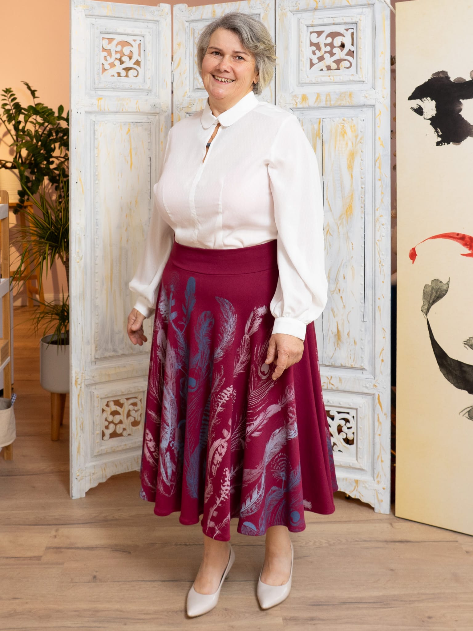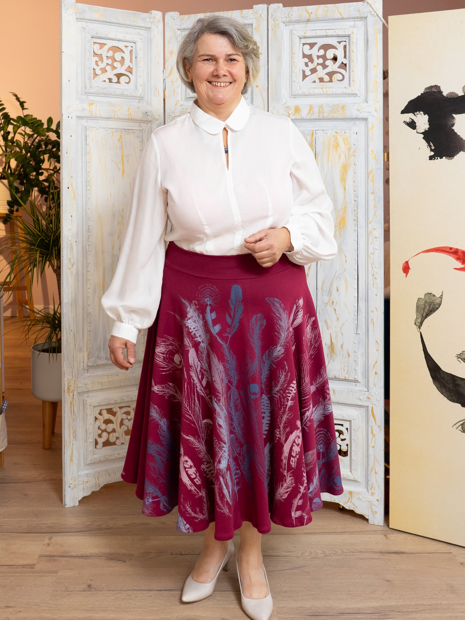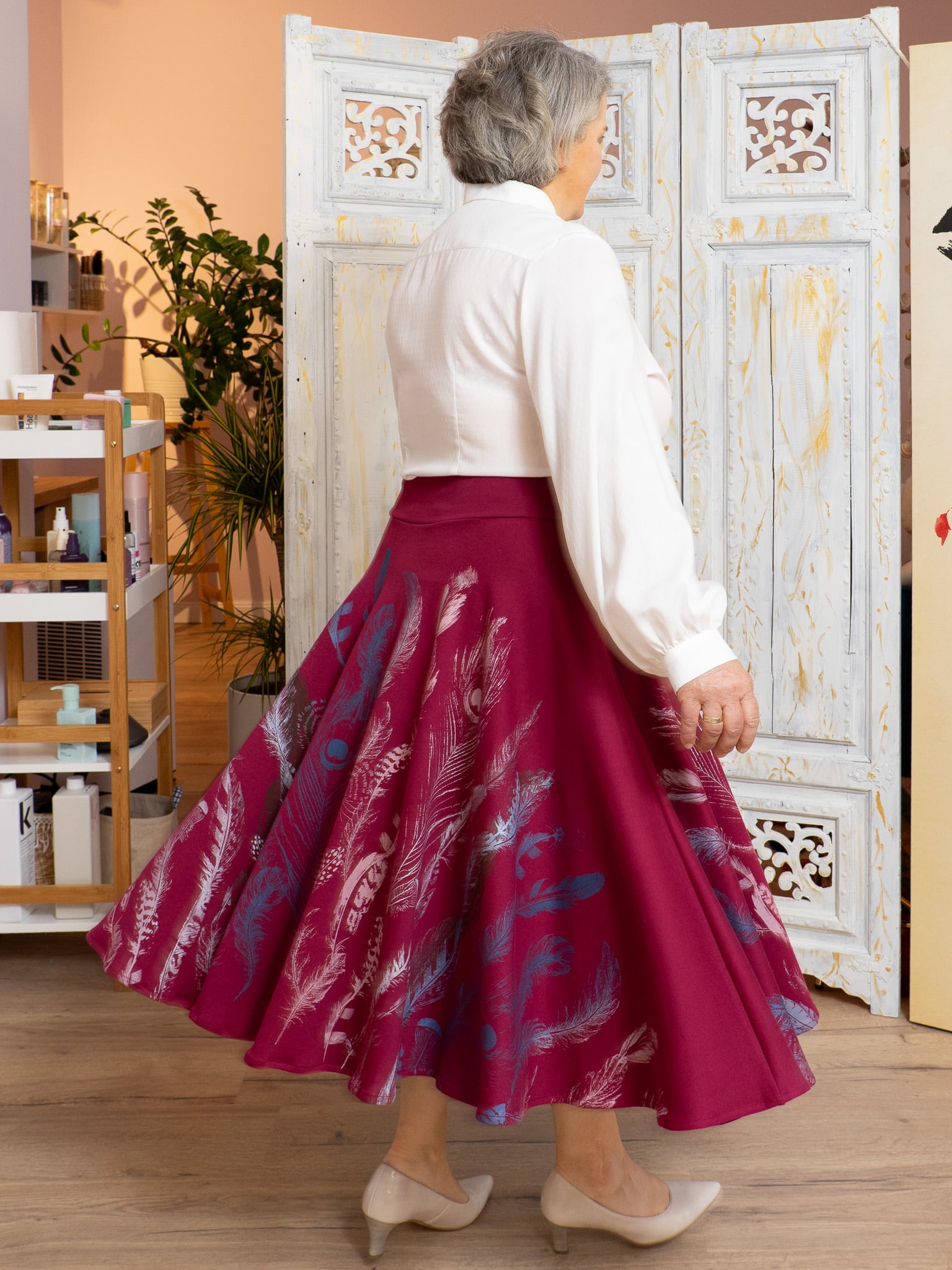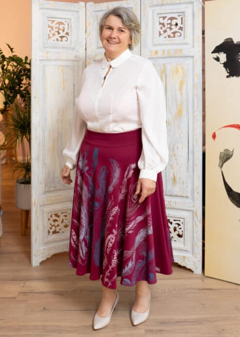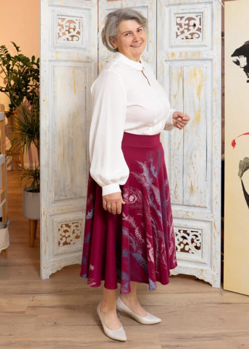 Eine Farbenpracht ist dieser bequeme Tellerrock in wunderschönem Beerenton. Die verschiedenen Federn sollte auf den unermesslichen Wert unserer vielfältigen gefiederten Mitbewohner hinweisen. Der Farbverlauf ist wunderbar bunt und lebendig.