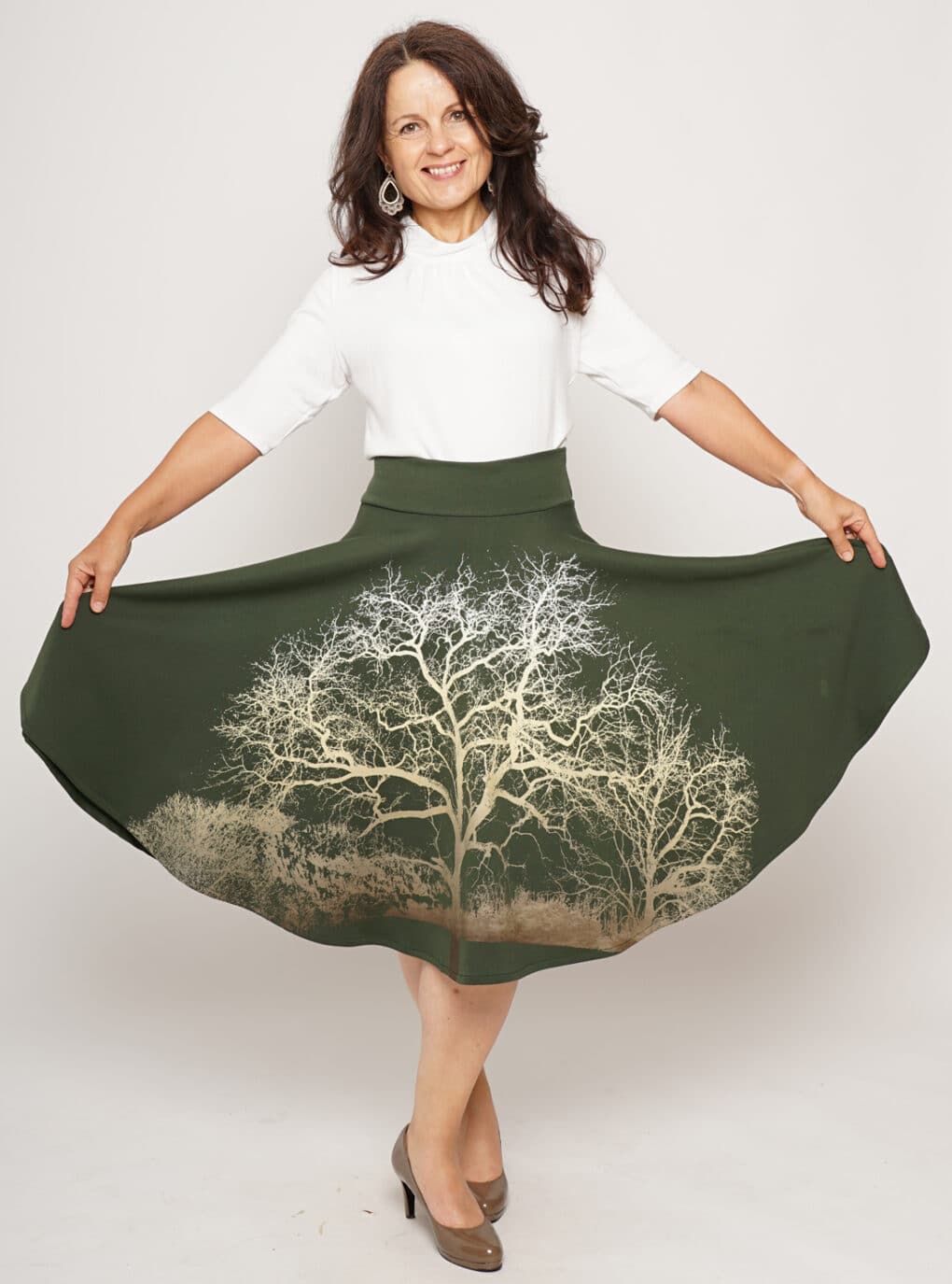 Dieser hübsche Tanzrock von Peaces.bio sieht nicht nur toll aus, sondern trägt sich auch sehr angenehm. Er ist aus kräftigem Bio-Baumwollstoff gefertigt und von Hand mit dem Kunstdruck „Zauberlandschaft“ bedruckt.