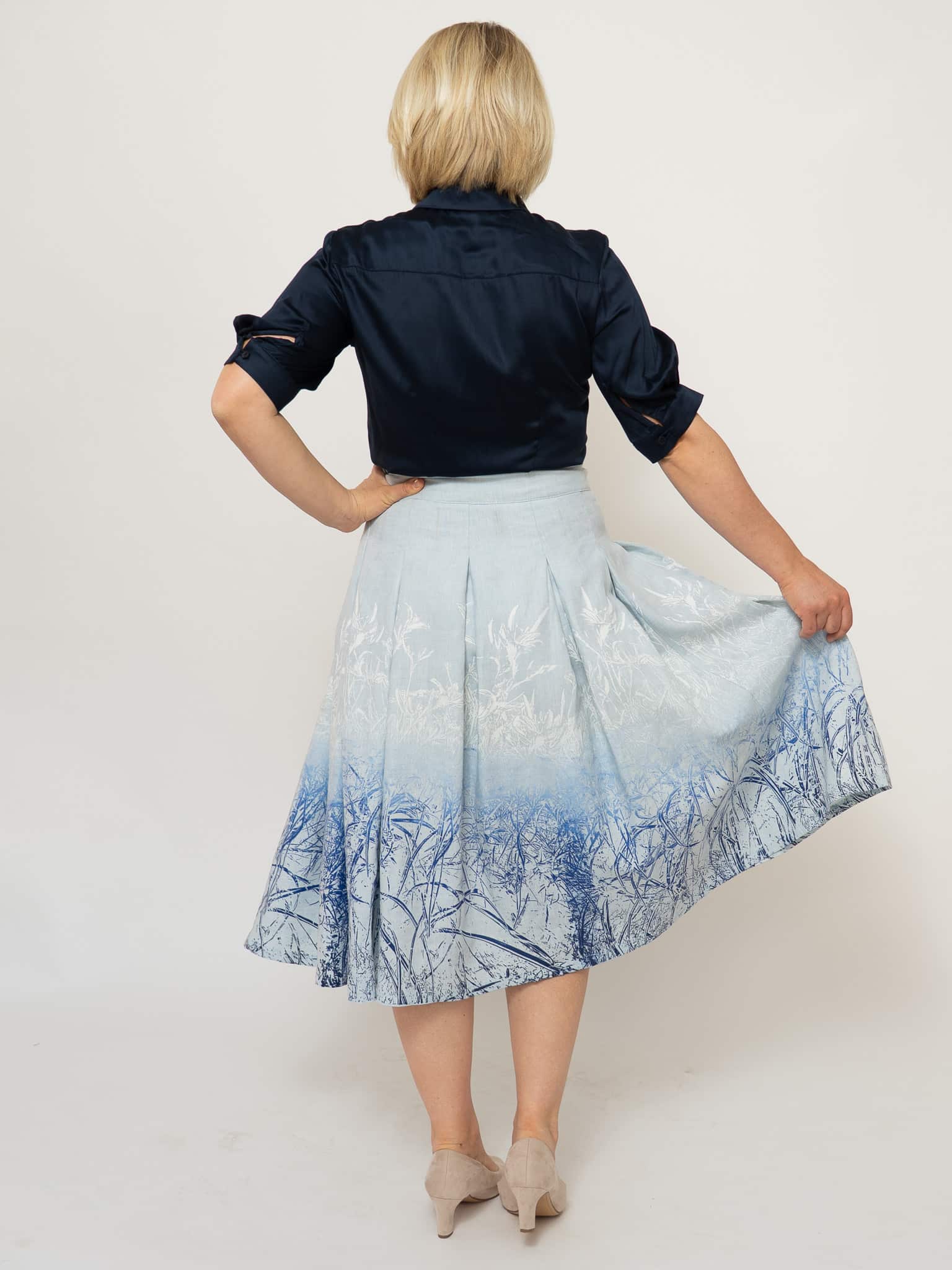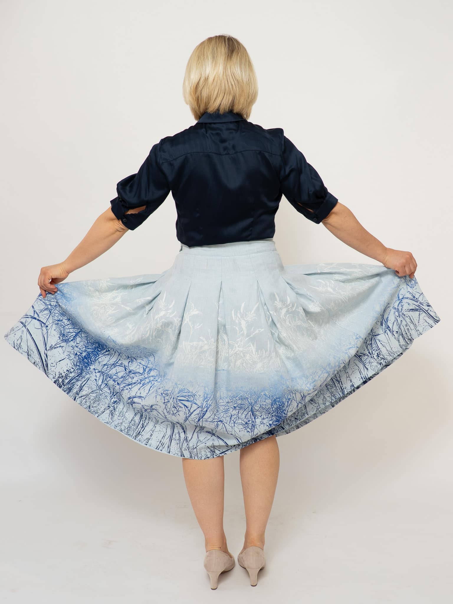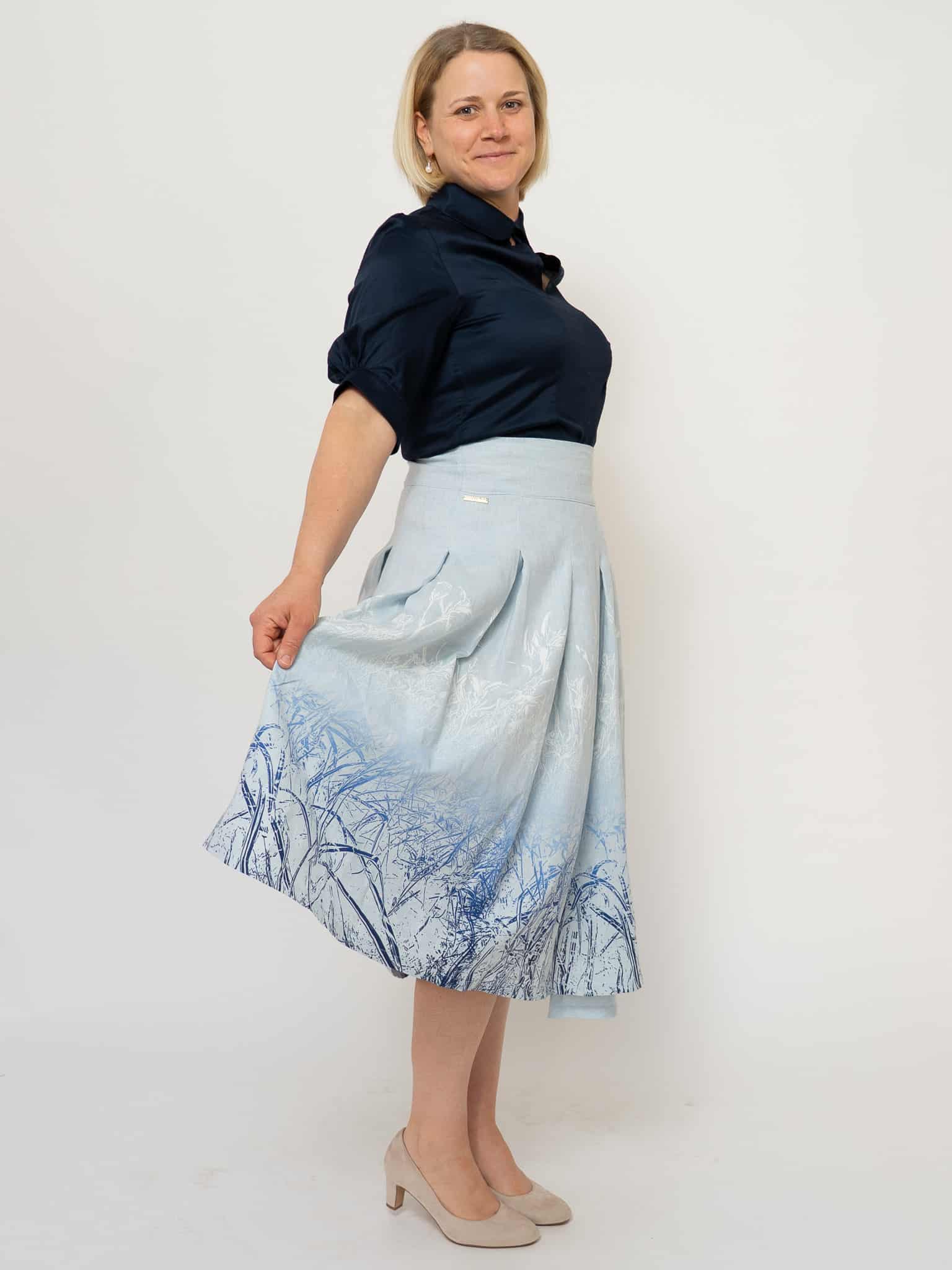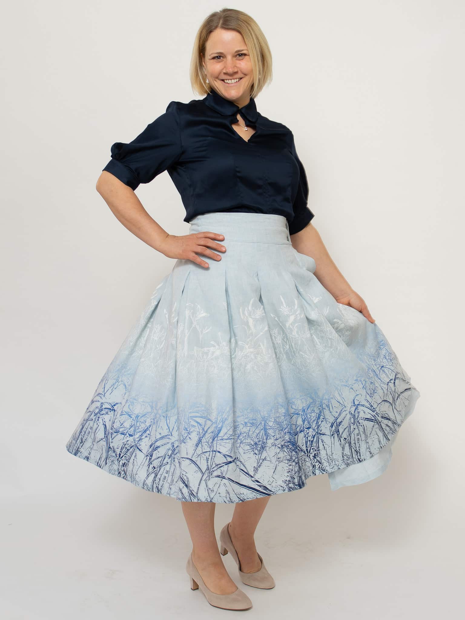 Ein zauberhafter Rock aus 100% Bioleinen von Vieböck, mit Taglilien in einem lebendigen Farbverlauf von Dunkelblau bis Weiß am oberen Ende.
