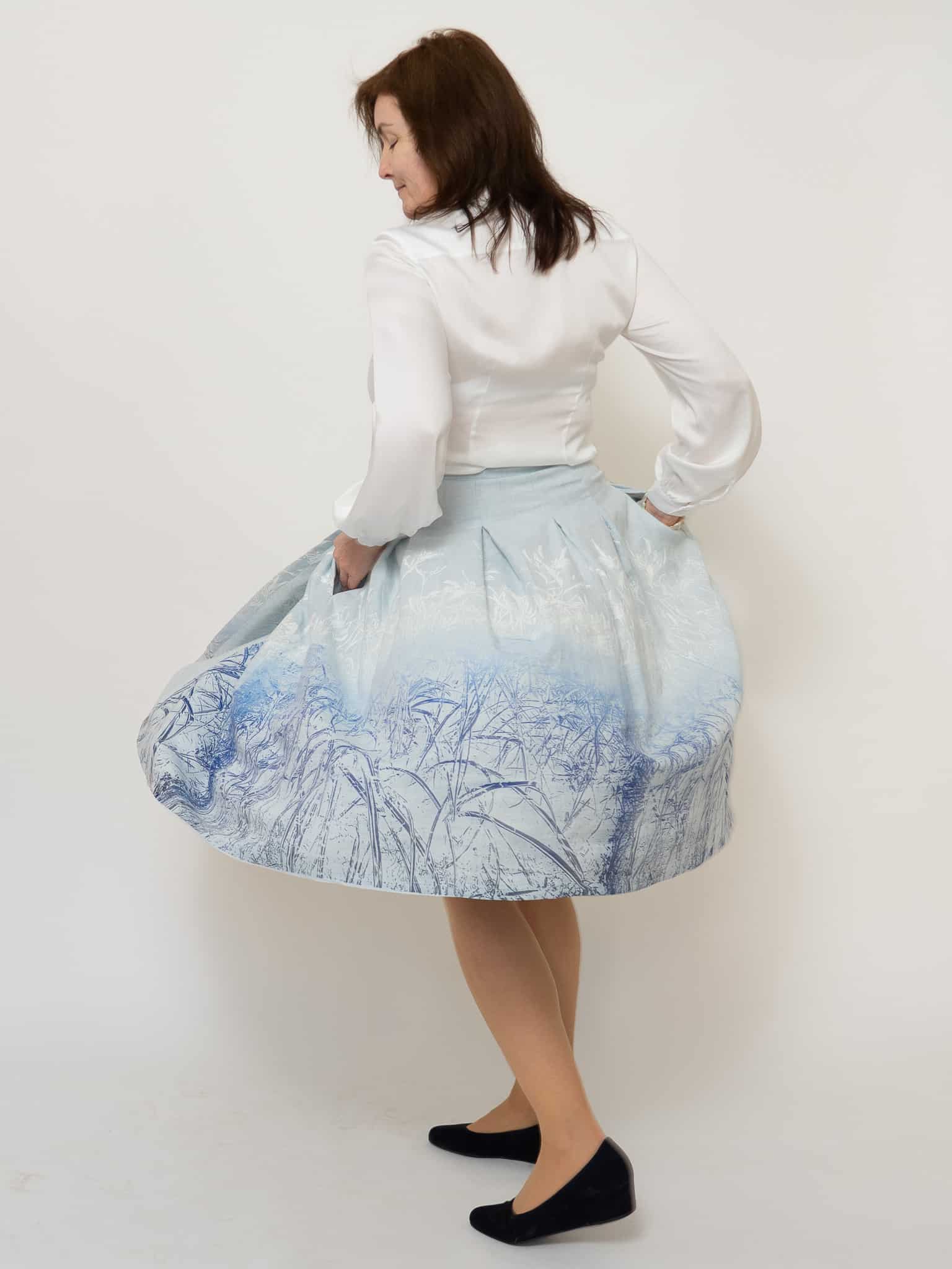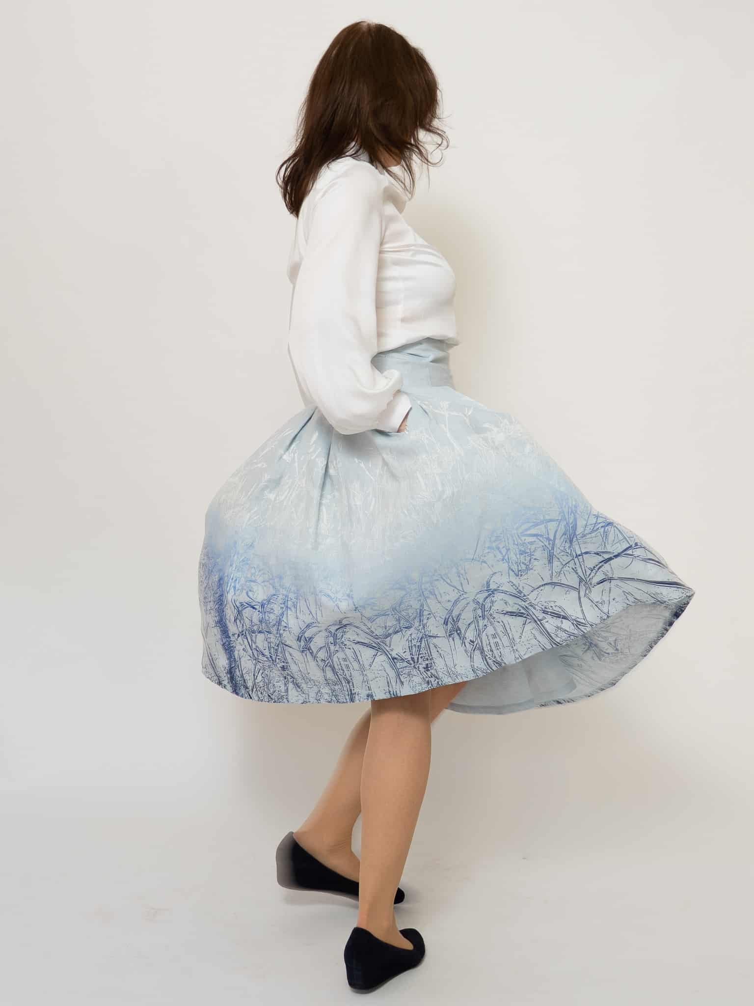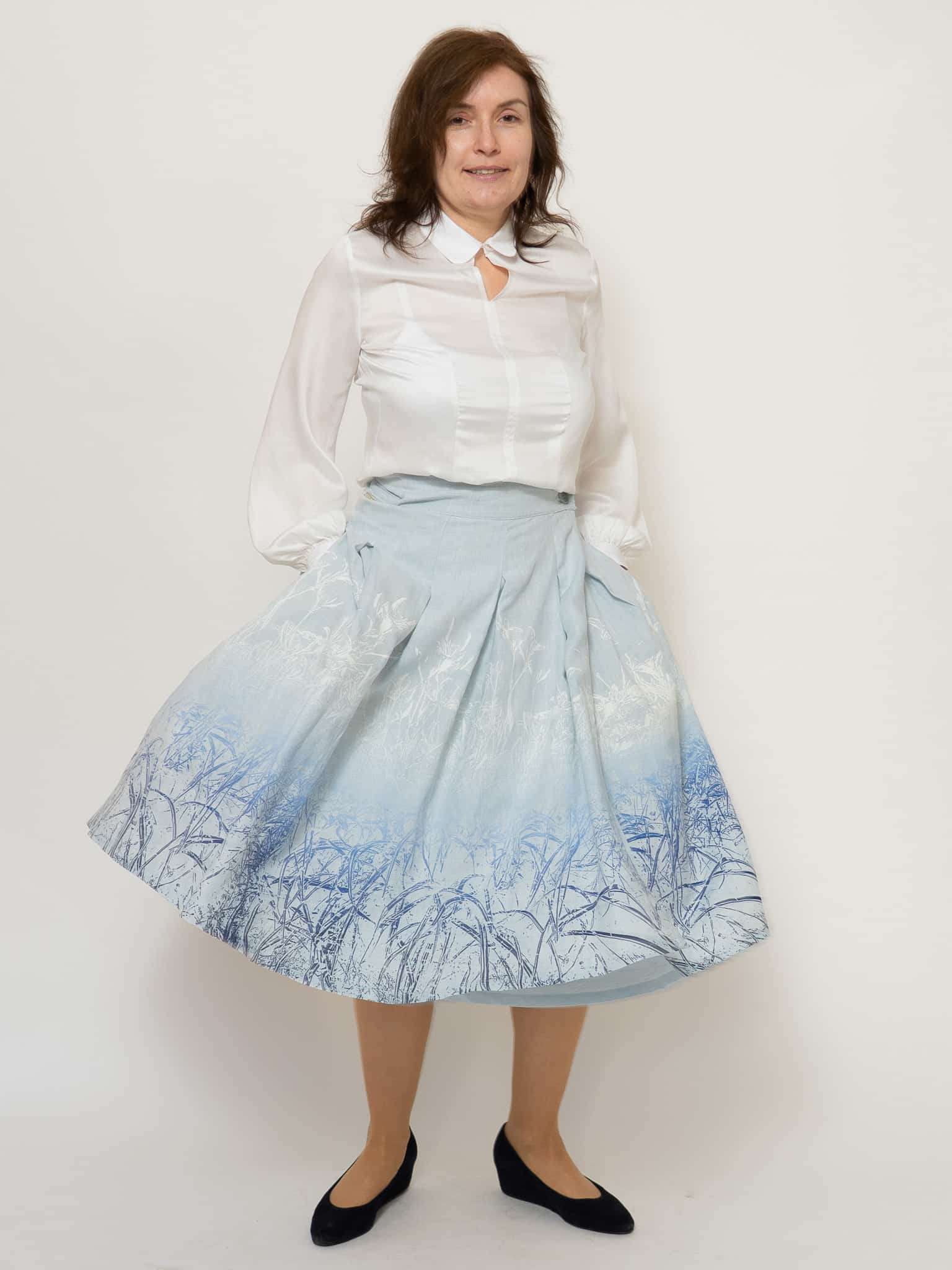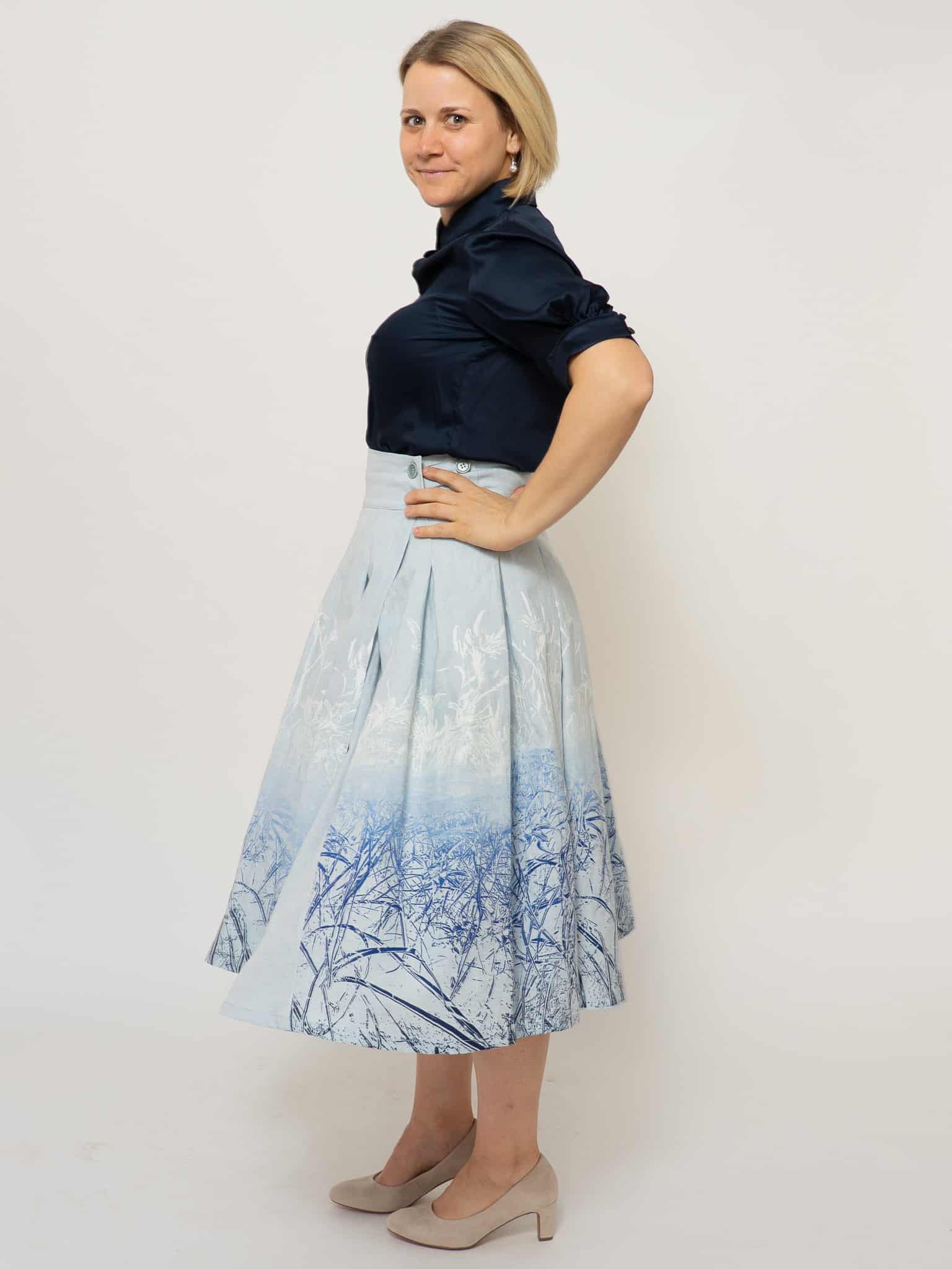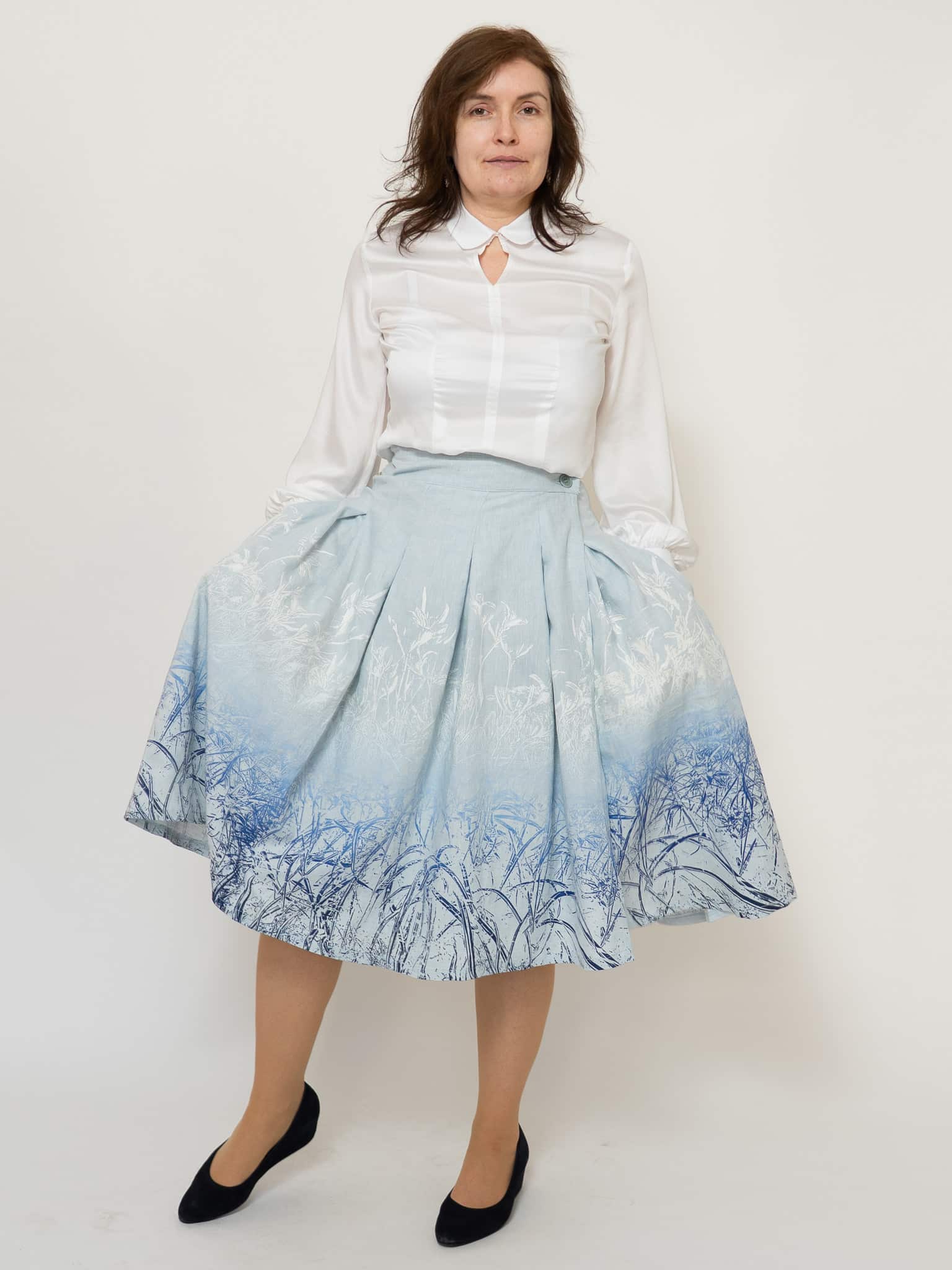 Ein zauberhafter Rock aus 100% Bioleinen von Vieböck, mit Taglilien in einem lebendigen Farbverlauf von Dunkelblau bis Weiß am oberen Ende.