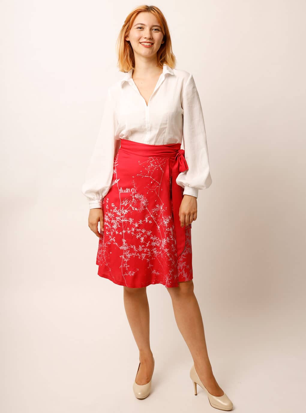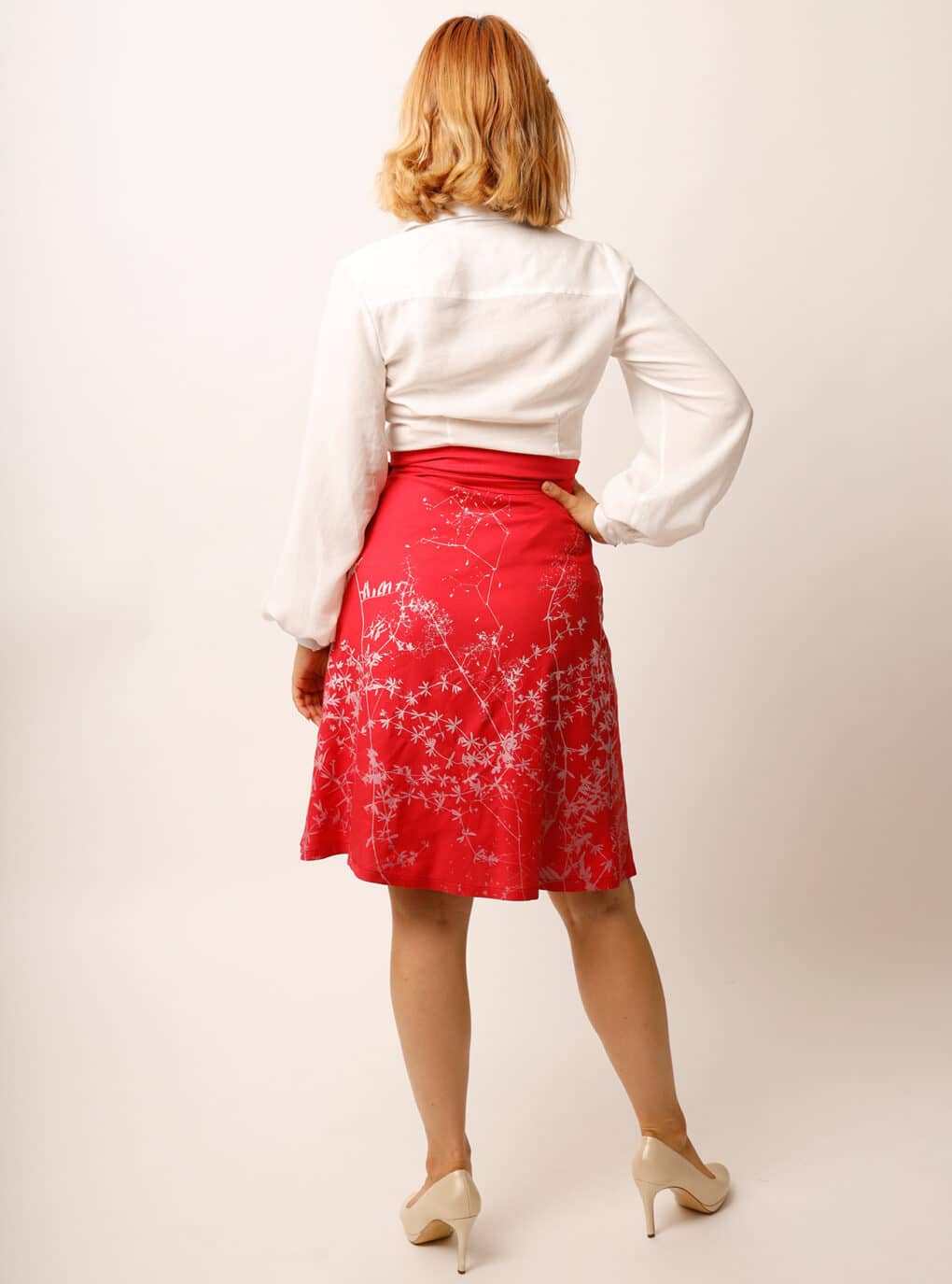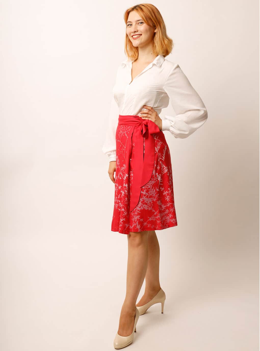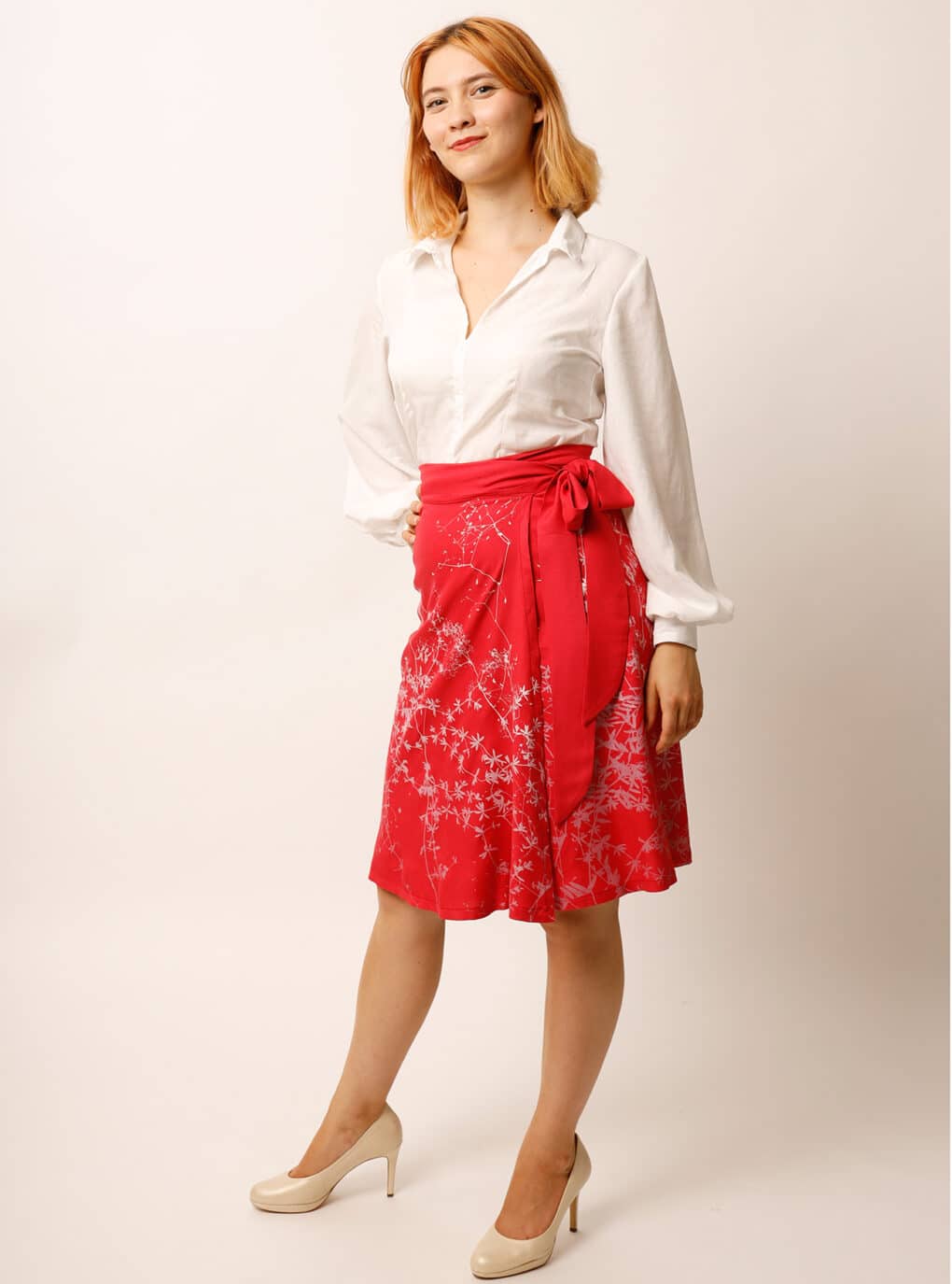 Ein traumhafter, knielanger Wickelrock in kräftiger Farbe und mit dem wunderschön strahlendem Druckmotiv Rankenzauber.  Der leichte Lenzing® Ecovero® Holzstoff fällt schön fließend und vermittelt ein ausgesprochen angenehmes Tragegefühl.